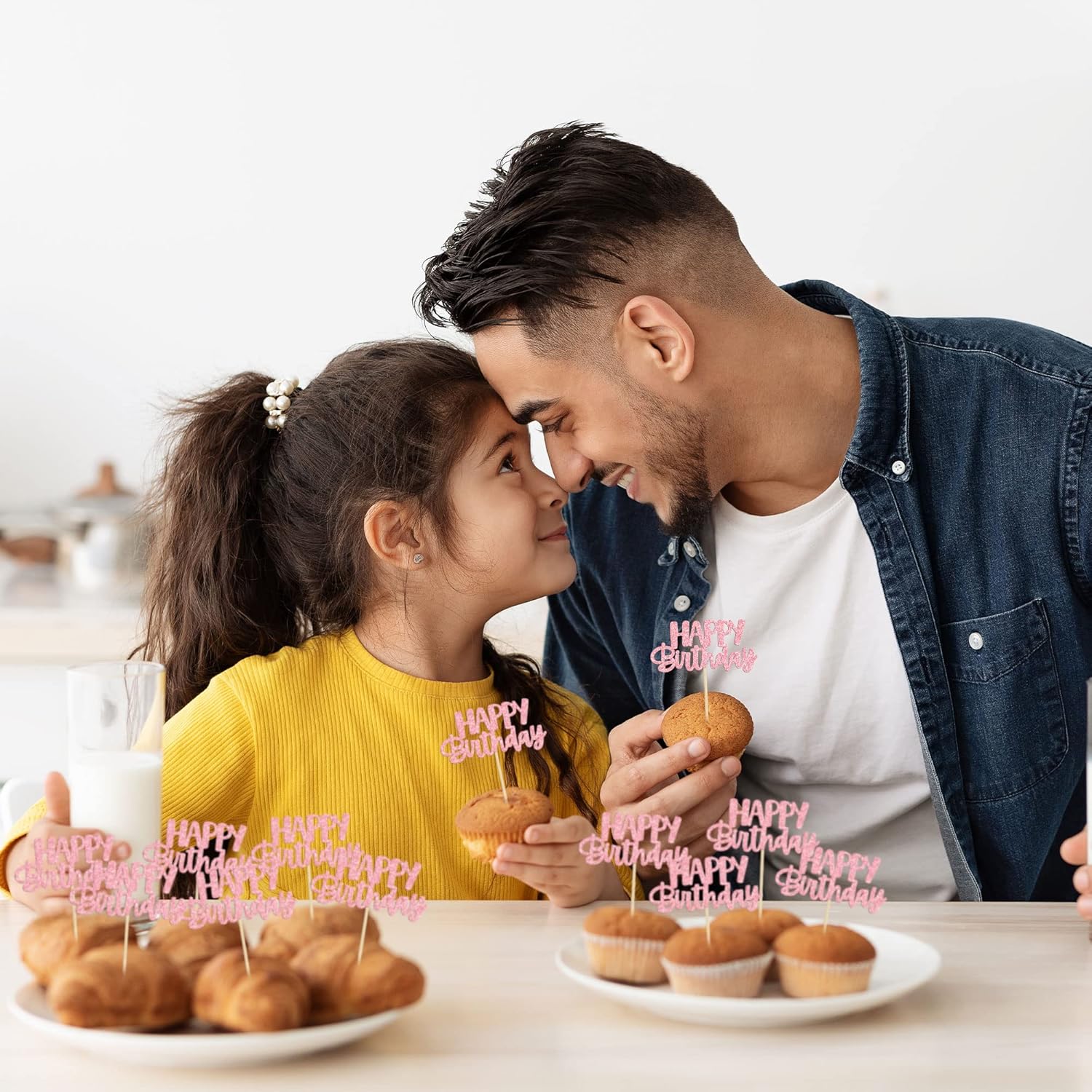 Gyufise 24Pcs Happy Birthday Cupcake Toppers Pink Glitter Celebrating Birthday Cake Picks Baby Shower Kids Birthday Party Decoration Supplies
