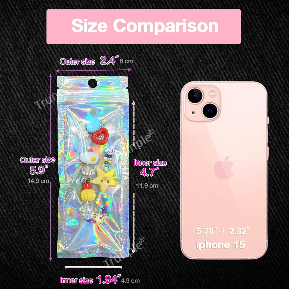 - Holographic Packaging Bags - 100pcs. Outer sise is 2.4x5.9", Inner size is 2x4.6". Please choose the right size per your demand. The size for these packaging bags is small, just for small products, such as snack, lip gloss, small decorative accessories, jewelry, candy, eyelash, car freshies etc. Perfect supplies for home and office use as goodies bags, party favor bags.