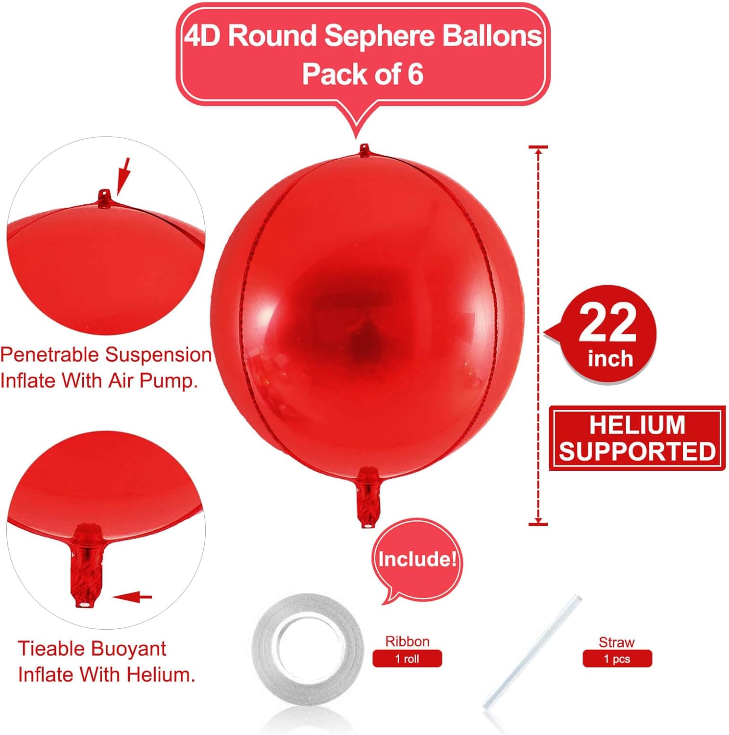 LHOAVWE 6 Pack 22 Inch 4D Red Balloons: 6 Pcs Round Foil Balloons (Uninflated) + Straw + 32 Foot Ribbon Roll - Red, Perfect for Birthday Parties