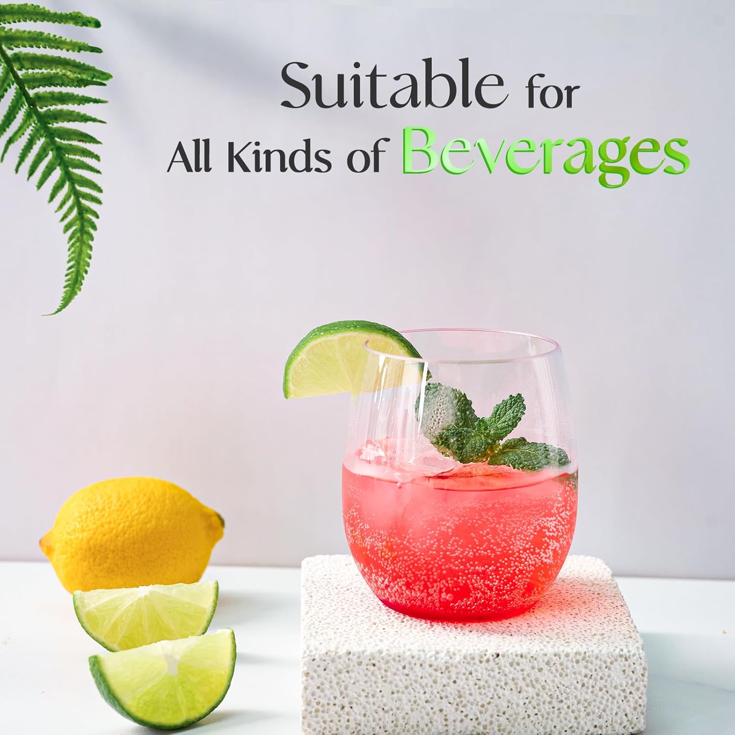 - The package includes 32 packs of 12 oz stemless clear plastic wine glasses, premium disposable wine glasses to save you time and effort and enjoy your event without having to worry about post party chaos