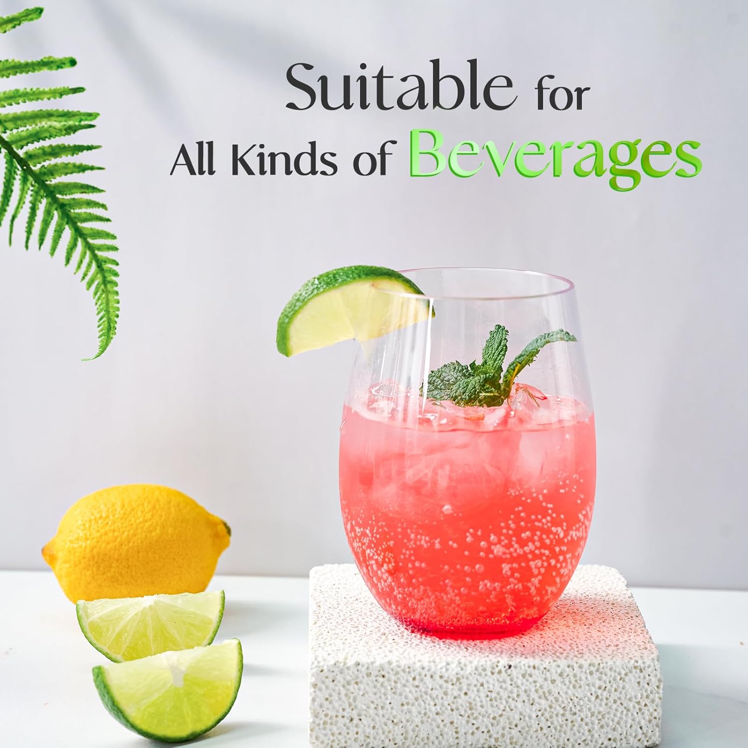 - The package includes 20 packs of 16 oz stemless clear plastic wine glasses, premium disposable wine glasses to save you time and effort and enjoy your event without having to worry about post party chaos