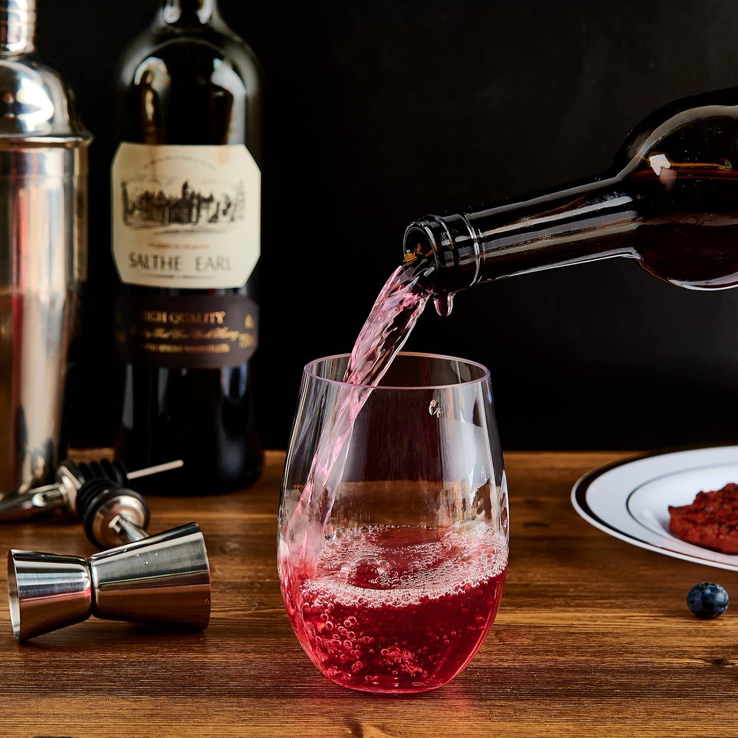 - Our clear stemless plastic wine glasses are heavy duty, unbreakable, shatterproof, disposable and reusable; High quality PET plastic makes the wine glass look crystal clear and adds a touch of ambiance to your party