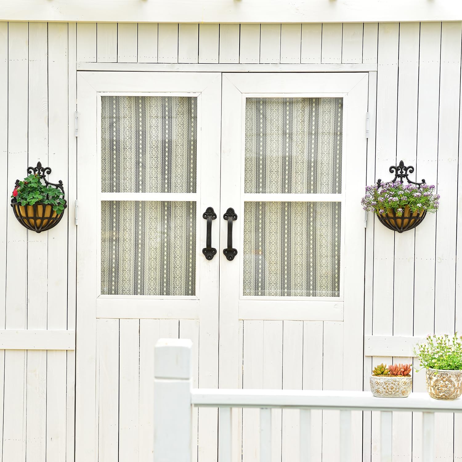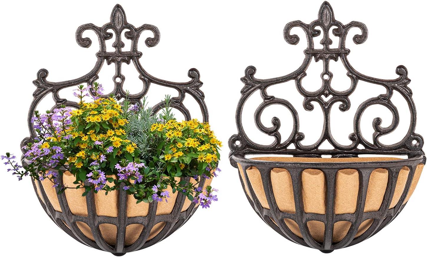Sungmor 2PC Small Cast Iron Baskets, Heavy-Duty Wall Hanging Hollow Planter w/Fabric Liner, Antique Victoria Half Round Wall Pot Plants Holder, Outdoor Railing Fence Balcony Hanging Basket Flower Pot