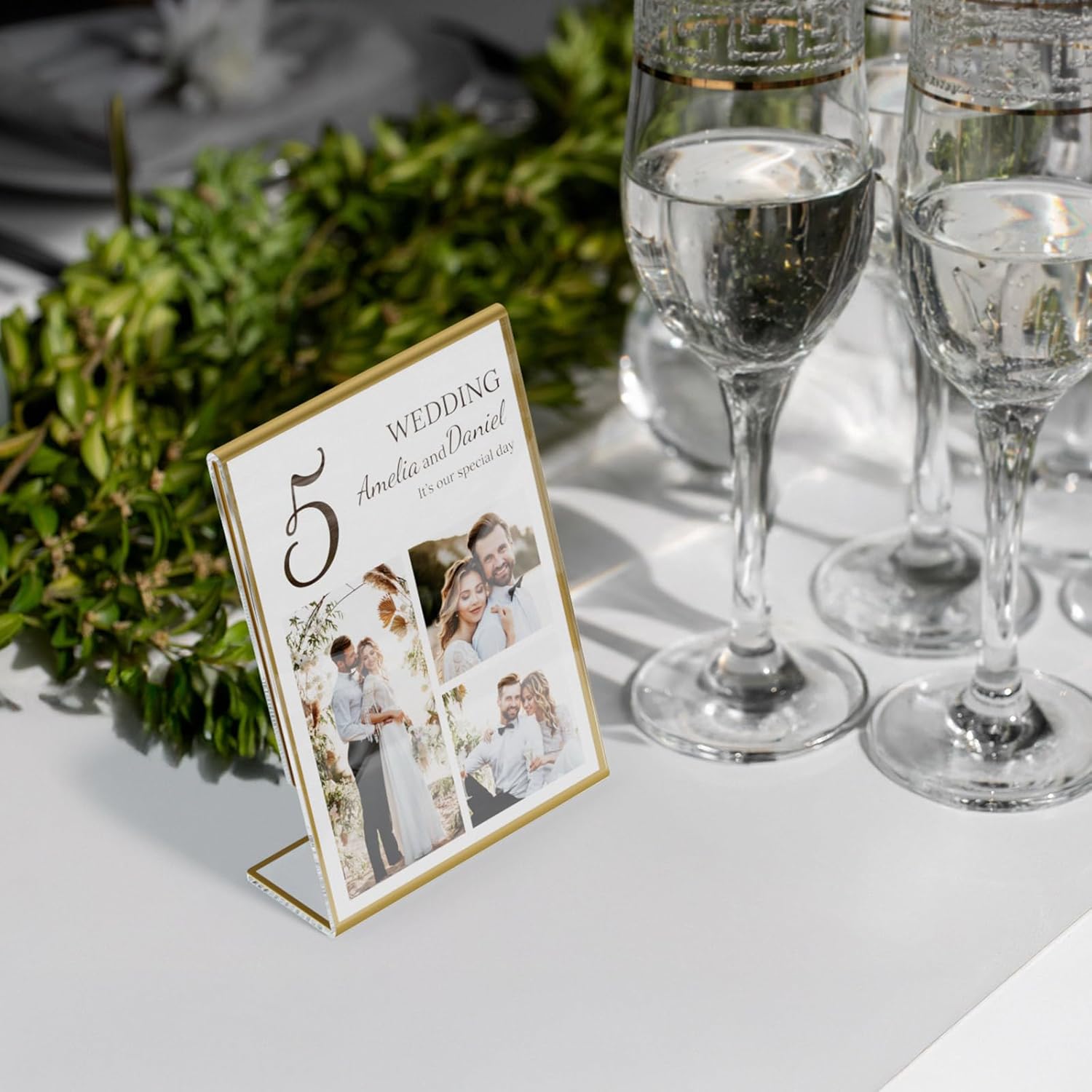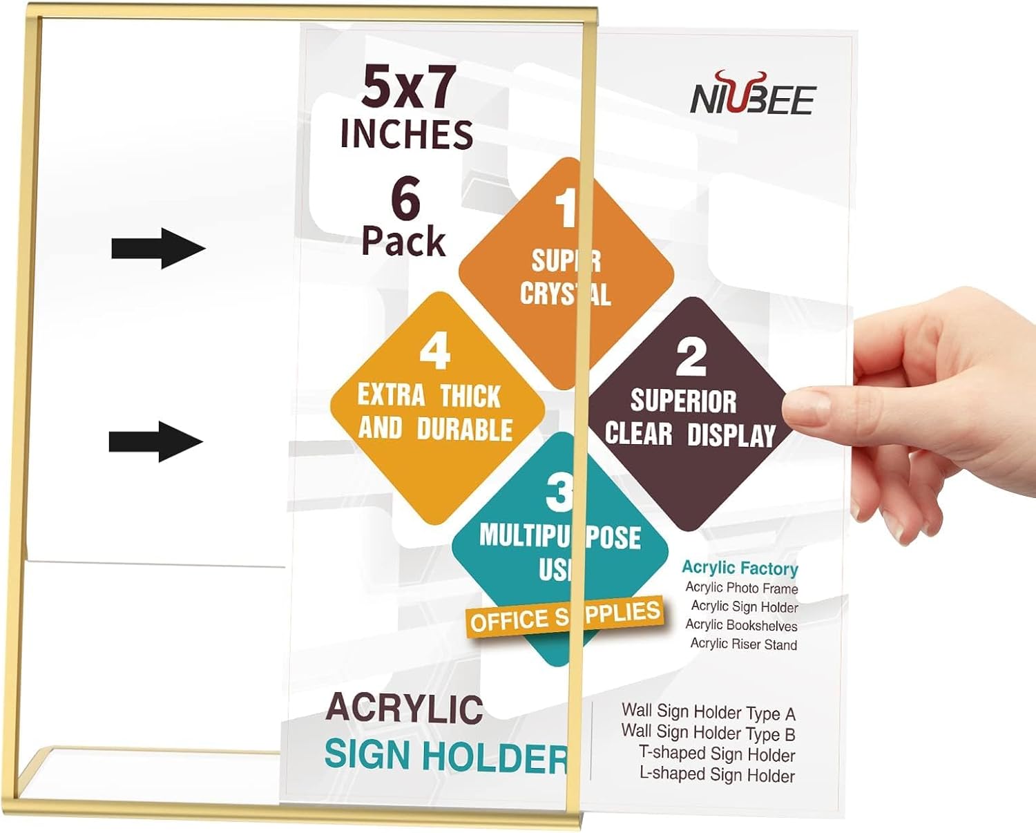 NIUBEE 6 Pack 5 x 7 Acrylic Gold Frame, Slanted Back Table Sign Holder for Wedding Table Numbers, Restaurant Signs, Photos and Art Display Visit the Store