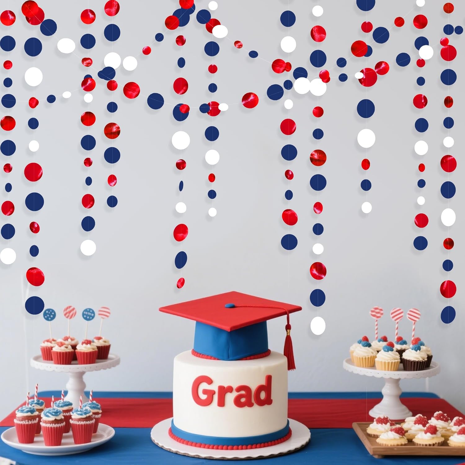 46 Ft Navy Blue Red White Circle Dots Garlands Royal Blue Red Hanging Paper Polka Dots Streamer for 4th of July American Independence Day USA National Day Patriotic Veterans Party Decorations Supplies