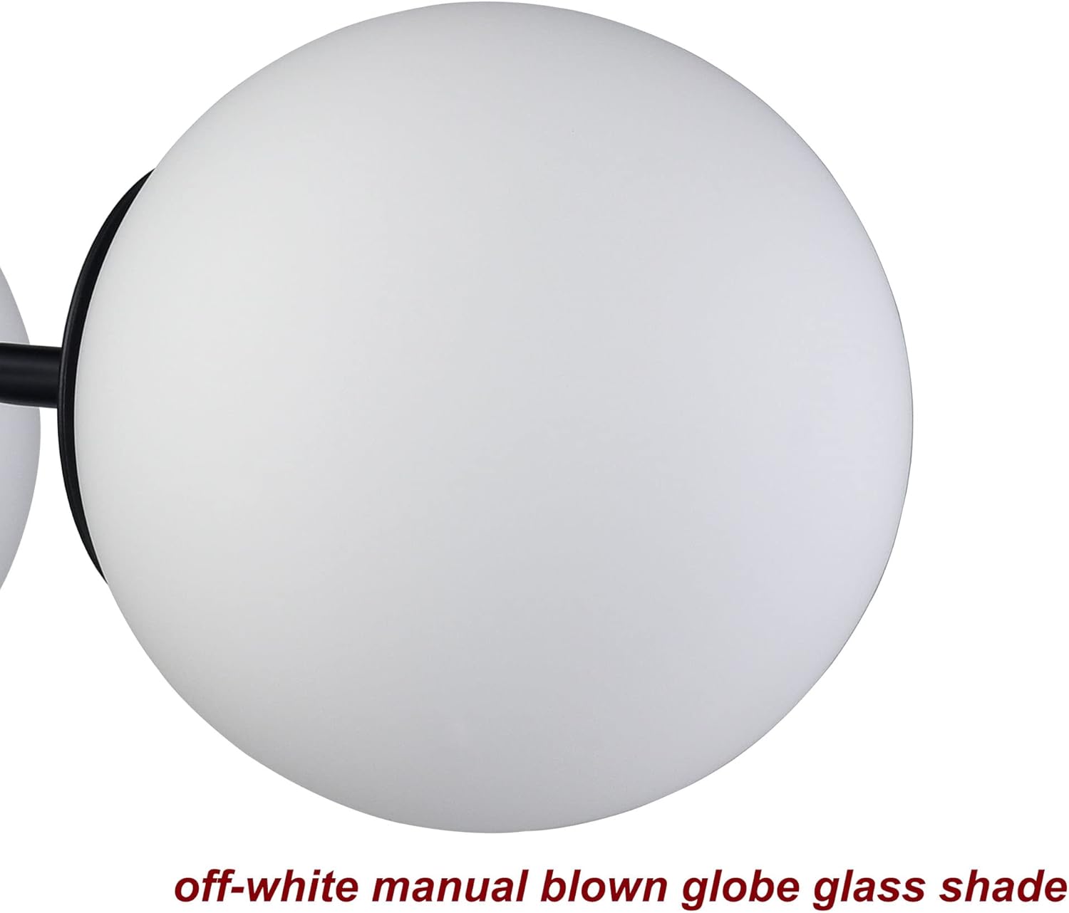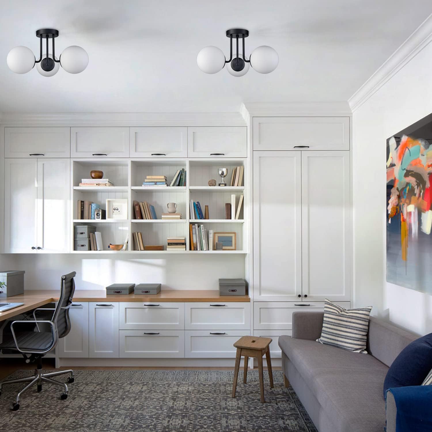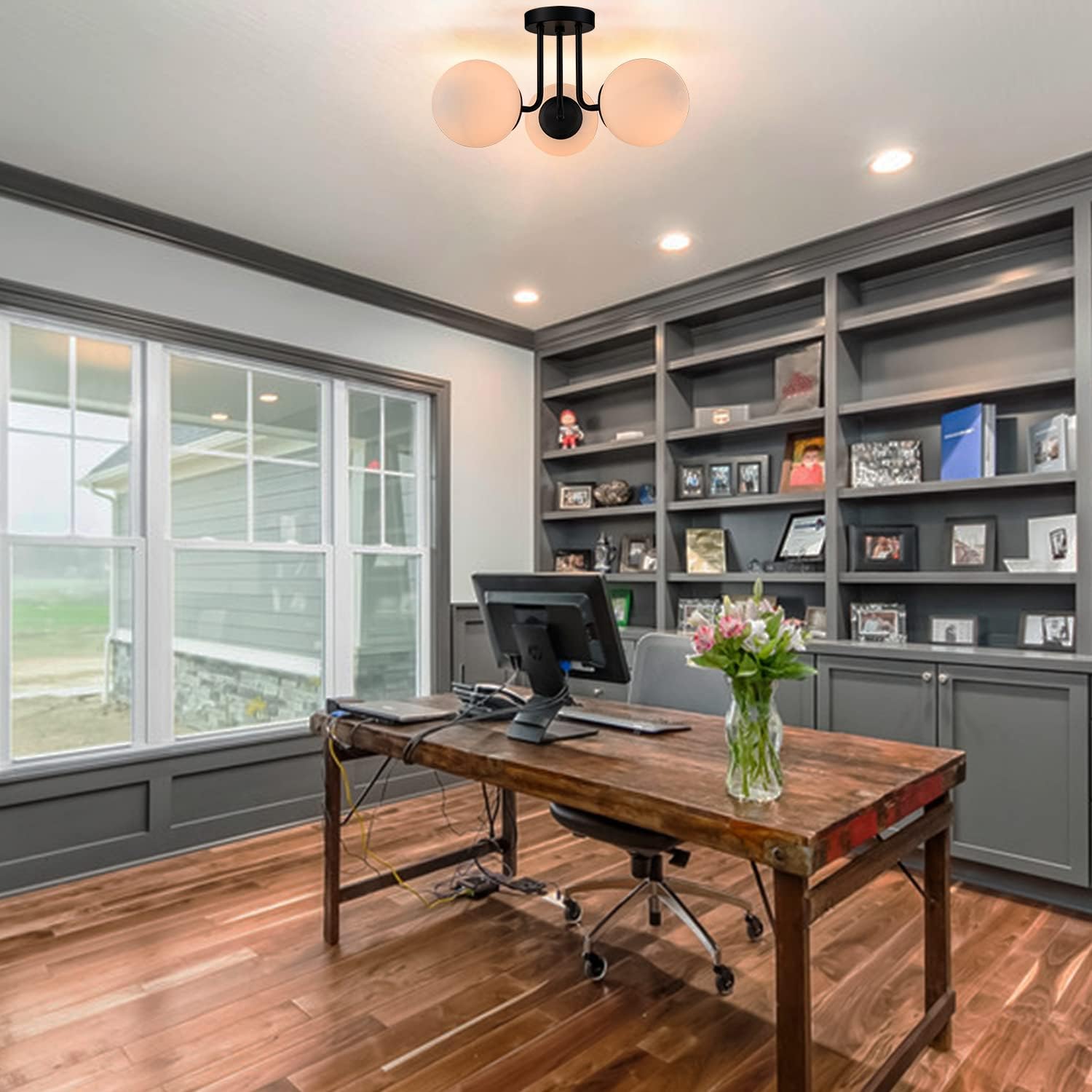 - 3-light matte black semi flush mount ceiling light made of high quality metal,which features 220-degree high-temperature baking varnish craft for strong adhesion.Crafted from globe opal manual blown glass shade,that offering more uniform and soft lighting without shadows.