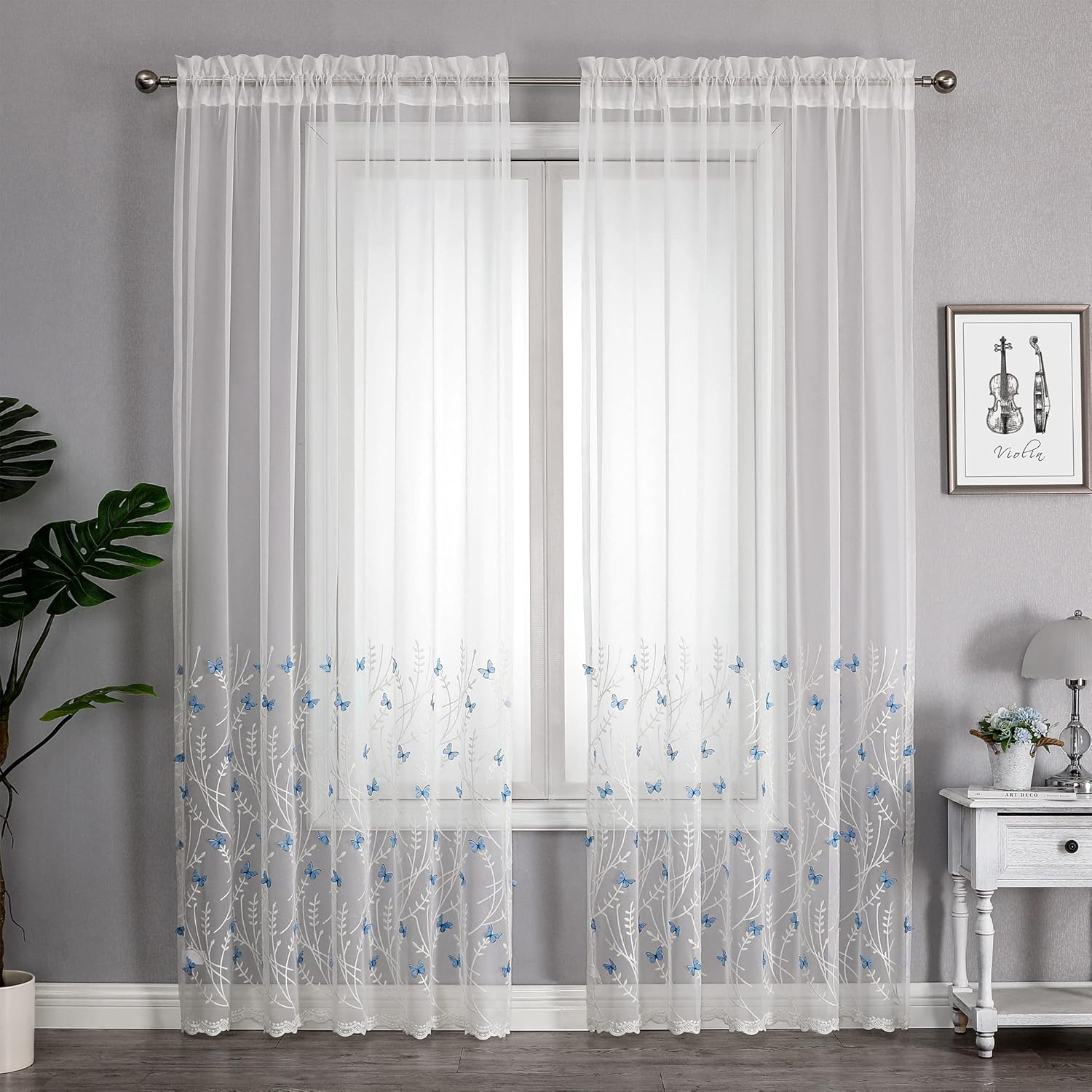 VISIONTEX White Sheer Voile Curtains, Decorative White Embossed Butterflies Rod Pocket Window Drapes for Home Kitchen, Living Room and Bedroom 54 x 84 Inch, Set of 2 Curtain Panels