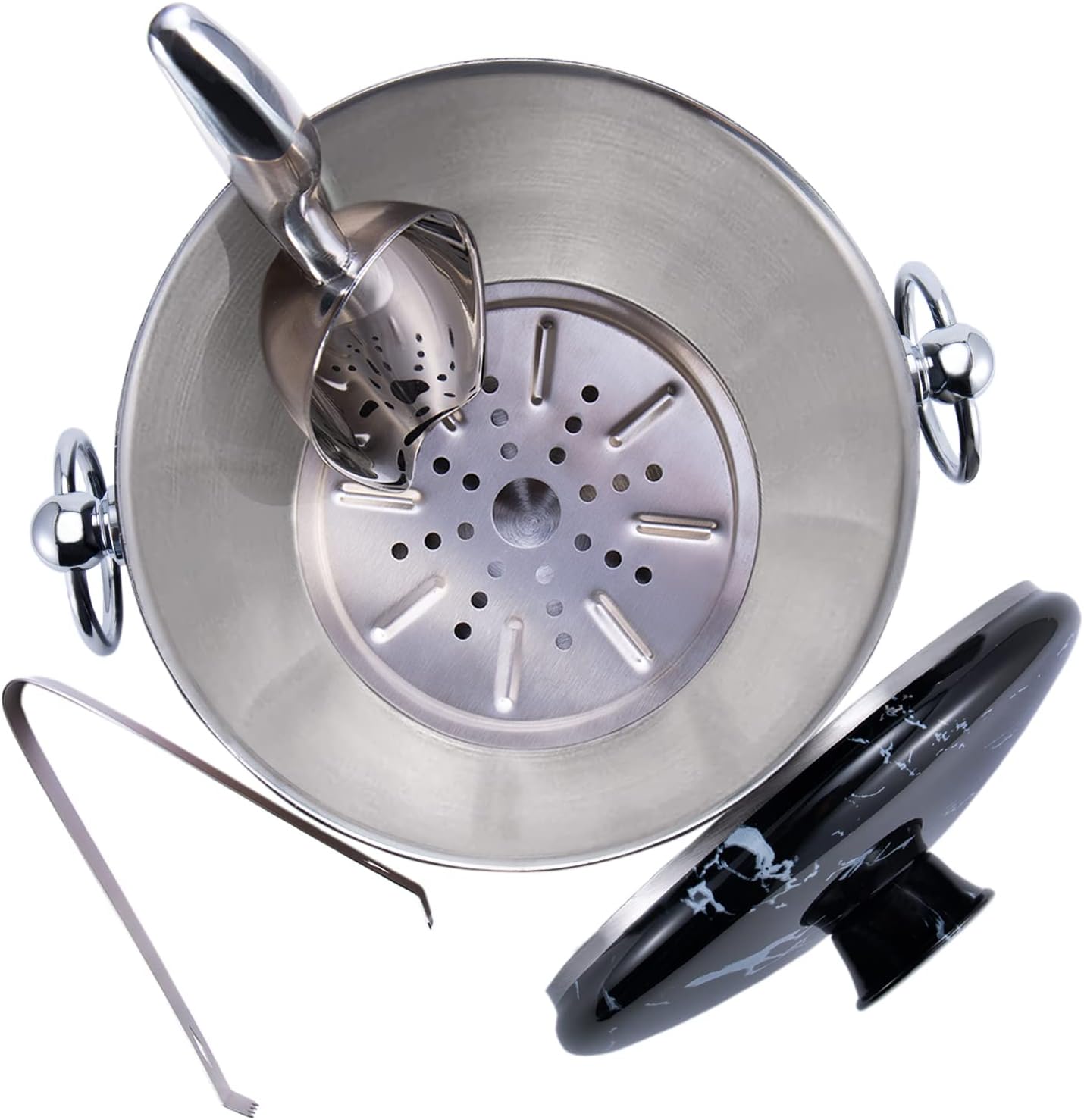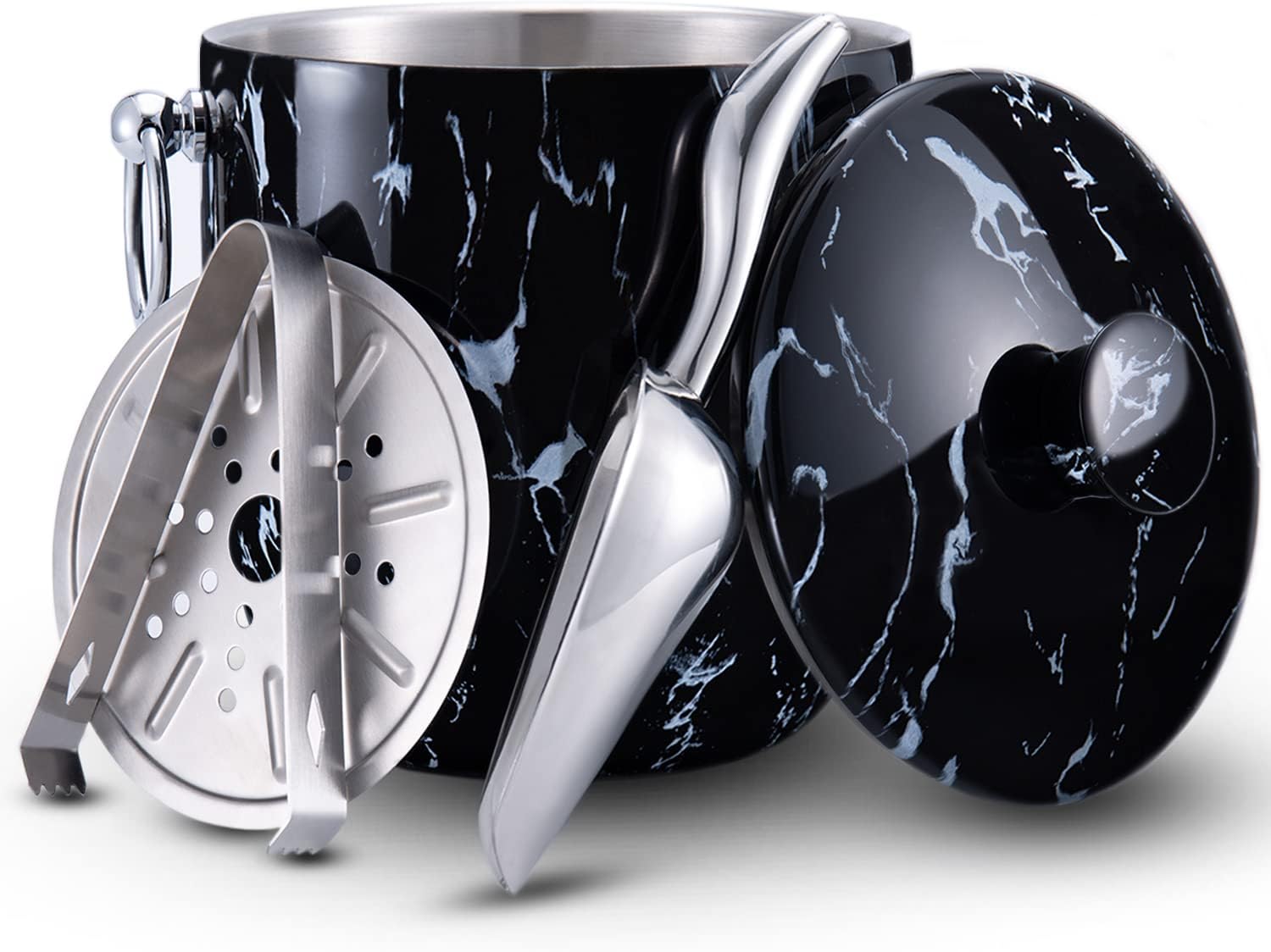 Ice Bucket with Lid, Scoop, Tongs and Strainer - Well Made Insulated Stainless Steel Keep Ice Frozen Longer - Ideal for Cocktail Bar, Parties, Chilling Wine, Champagne - 3 Liter (Black Marble)