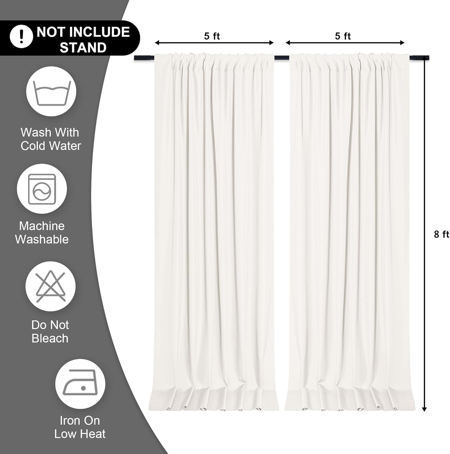 - DIMENSIONS: Each package includes 2 panels polyester backdrop drapes. Each curtain measures 5 feet wide x 8 feet high. Entire backdrop measures 10 feet wide x 8 feet high. Cannot block the light.