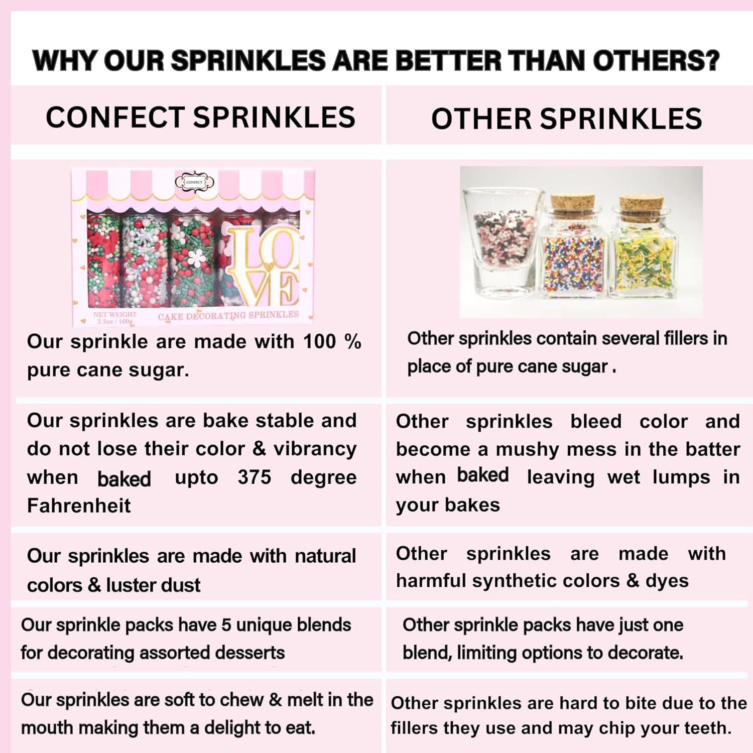 - Confect Sprinkles are made with the finest quality Ingredients & are soft to chew Sprinkles come in a unique pack of assorted colors and sizes.