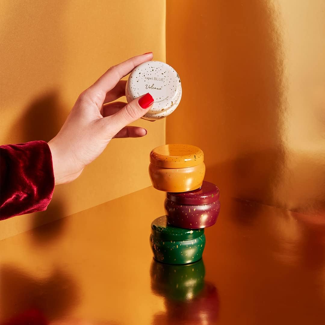 Capri Blue Glimmer Mini Tin - Volcano Scented Candle with Mini Tin Candle Holder - Soy Wax Blend - White and Gold (3 oz)