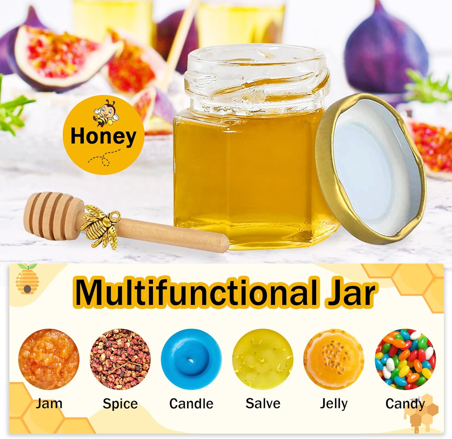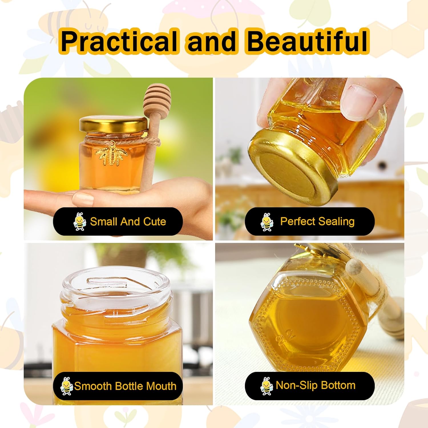- Cute Hexagon Honey Jars with Lids: These 1.5 oz glass honey jars with lids feature a clear, rounded design that blends charm and elegance. Perfect for weddings, gift baskets, or crafts, they add a sweet, refined touch to every occasion.