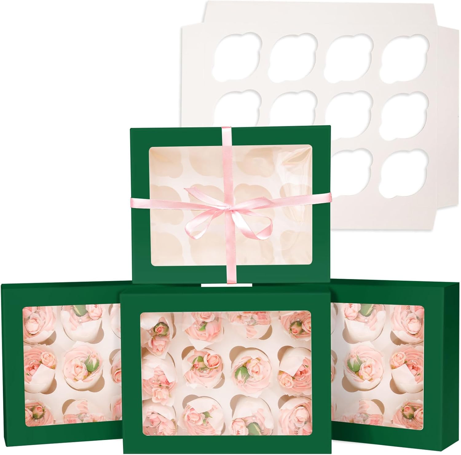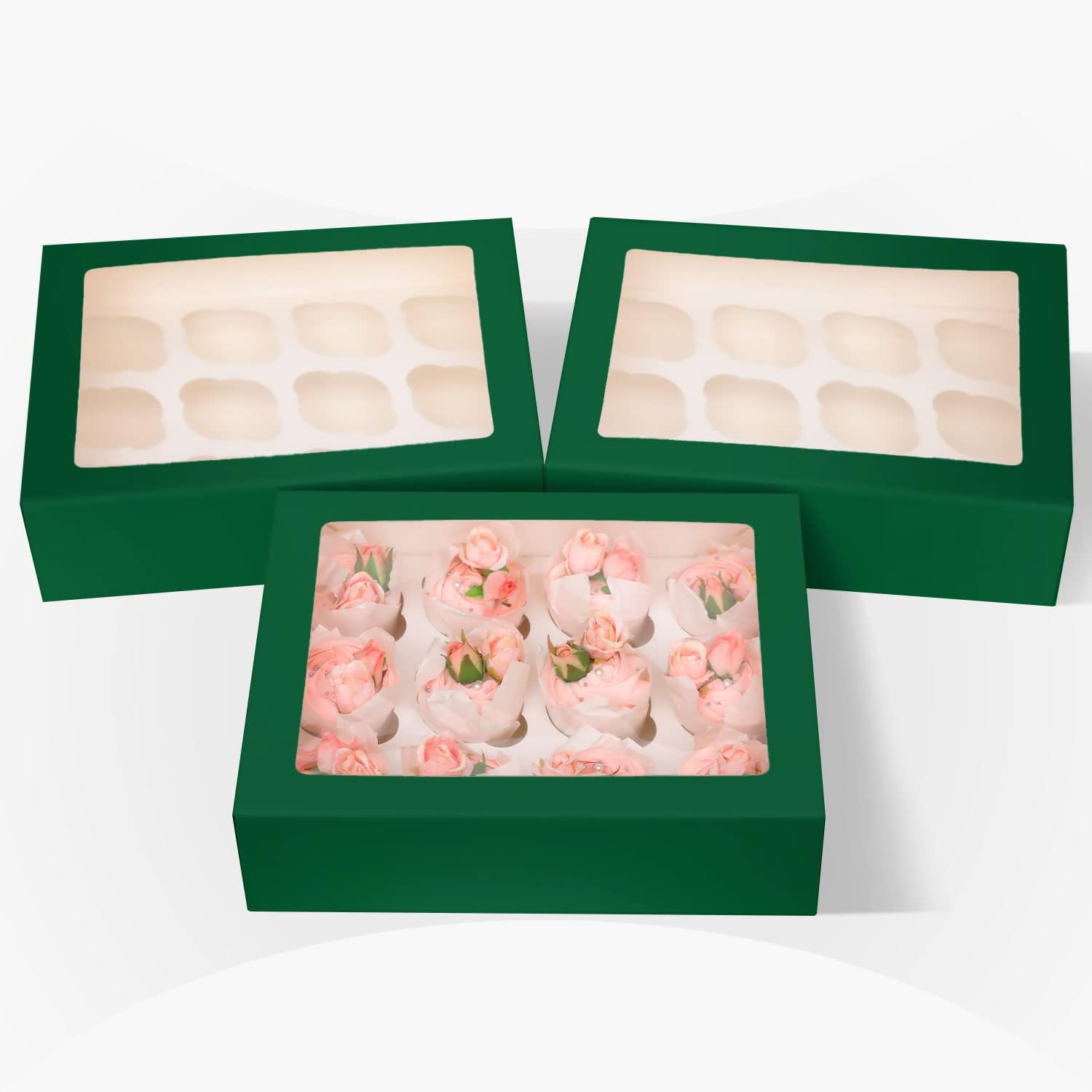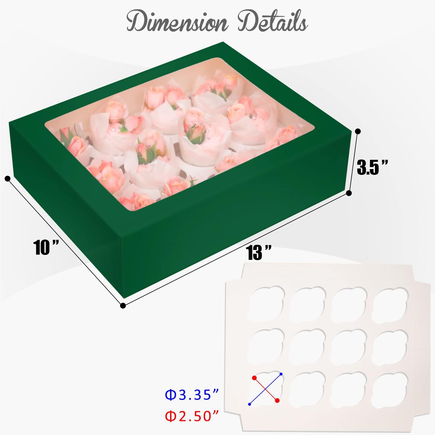 12 Cupcake Containers 10-Packs Forest Green Cupcake Box Cupcakes Carrier, 12 Cupcake Boxes with Window 13"x10"x3.5"(Auto-pop up)