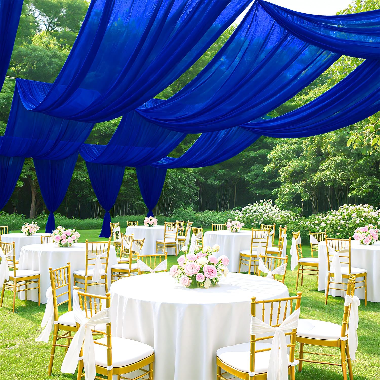 - ✿【Size - Wedding Ceiling Drapes】Package includes 2 panels royal blue chiffon fabric drapery. Size of each panel is 5FT( 60 inches) width by 20FT( 240 inches) length covering a total area of 10ft width x 20FT length. This wedding archway chiffon draping fabric can help your party to create a warm and elegant scenes.