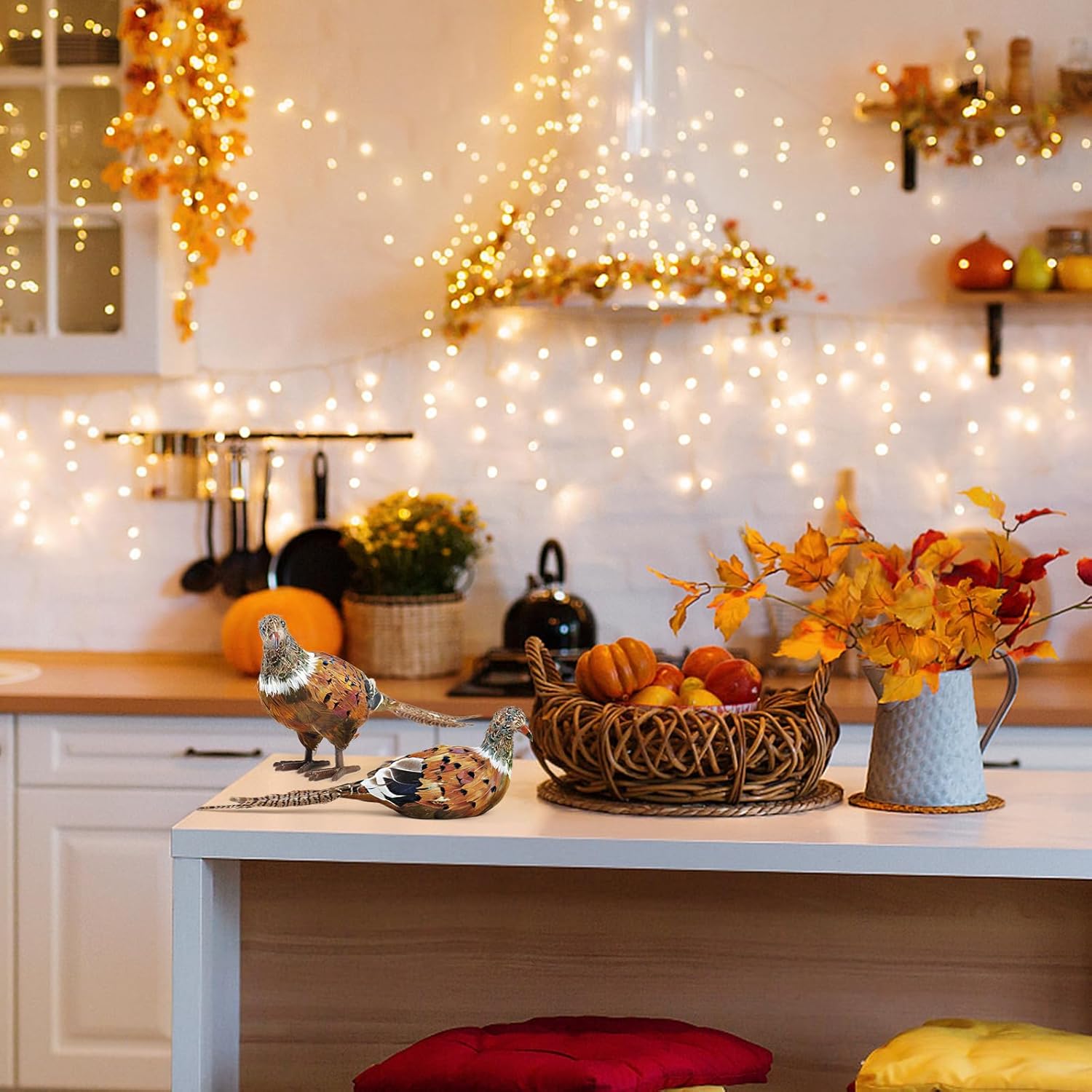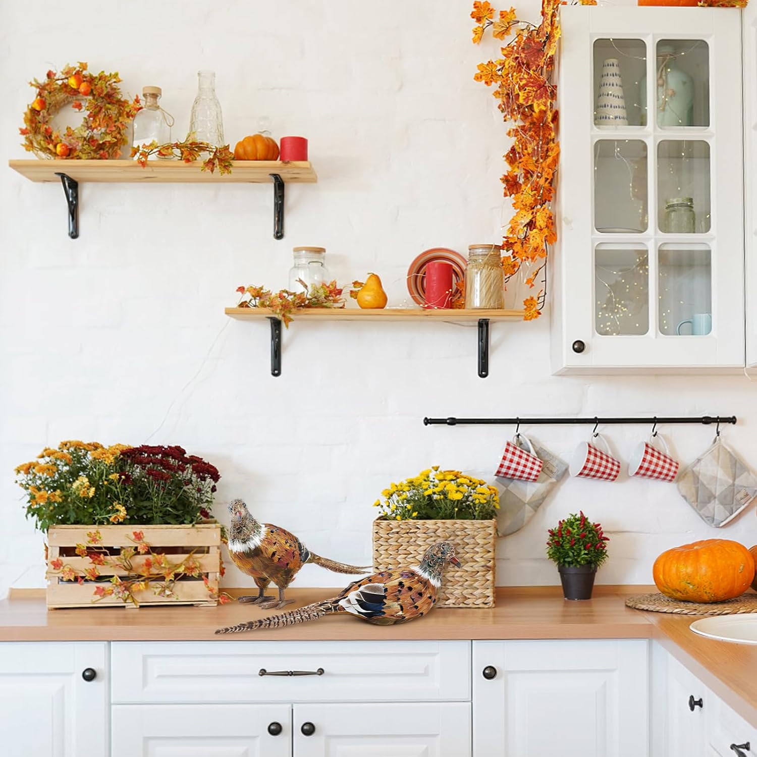 - [Unique Design] These elegant pheasant decorations contain a standing pheasant(13*3.5*6.5 inches) and a sitting pheasant(13.4*3.5*4.1inches)-they are like a couple and also a family! The charming gloss of natural feathers makes them look so real. As fall decor, they will make your home more graceful and full of vitality