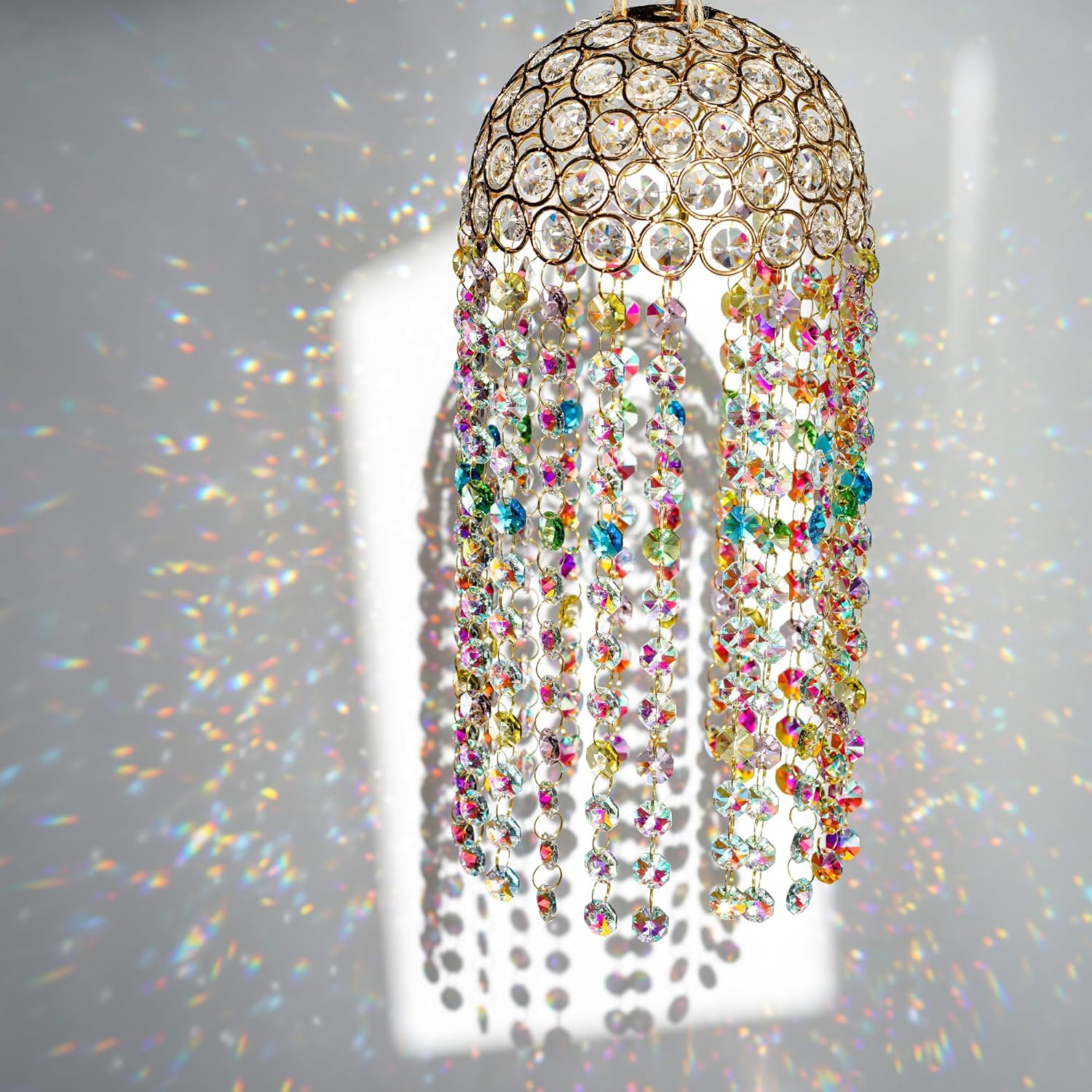 - Elegant Decoration: Add a touch of elegance to your home or office decor with these stunning crystal wind chimes. They produce the most beautiful reflections when sunlight or any other type of light hits them. Brighten your life. It is composed of many strip colorful bead chains, it looks so beautiful and plump.You will love it