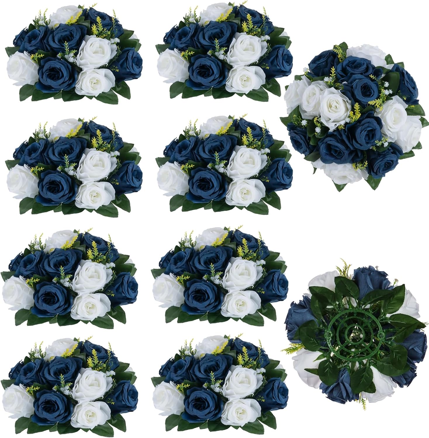 BLOSMON Navy Blue Flowers for Centerpieces: 10 Pcs Artificial Roses Flower Balls for Wedding Table - Fake Silk Kissing Bouquet Floral Arrangement for Home Party Event Decoration