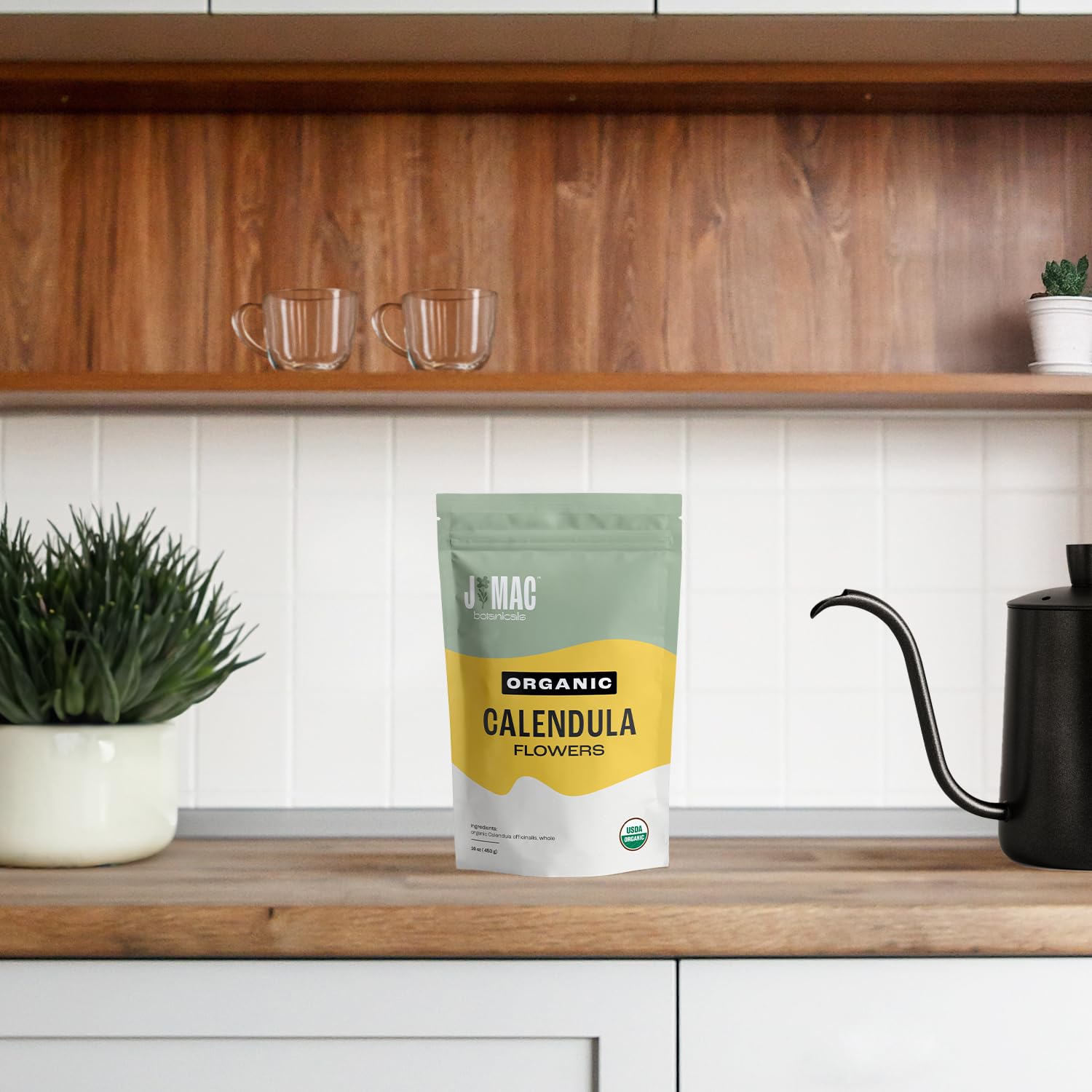 J Mac Botanicals, Organic Calendula Flower (4 ounce), whole dried flowers and petals, loose leaf tea, marigold flower, USDA Certified Organic. Great for loose leaf teas, cocktail bombs, salve