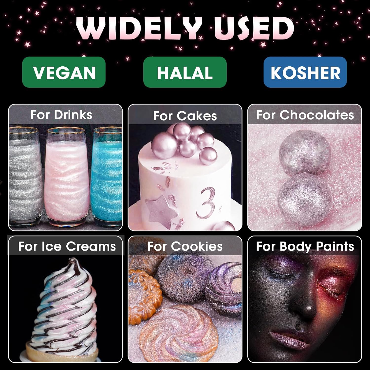 - ✔️【Vegan & Allergen-Free】Food-grade glitter uses only the highest quality vegan ingredients and does not contain common food allergens, including gluten, nuts or dairy products, so everyone can use and enjoy this product regardless of diet or food allergies. Unlike food contact glitter, these are 100% edible, so you don't need to worry about using them in your creations to make them sparkle for all.