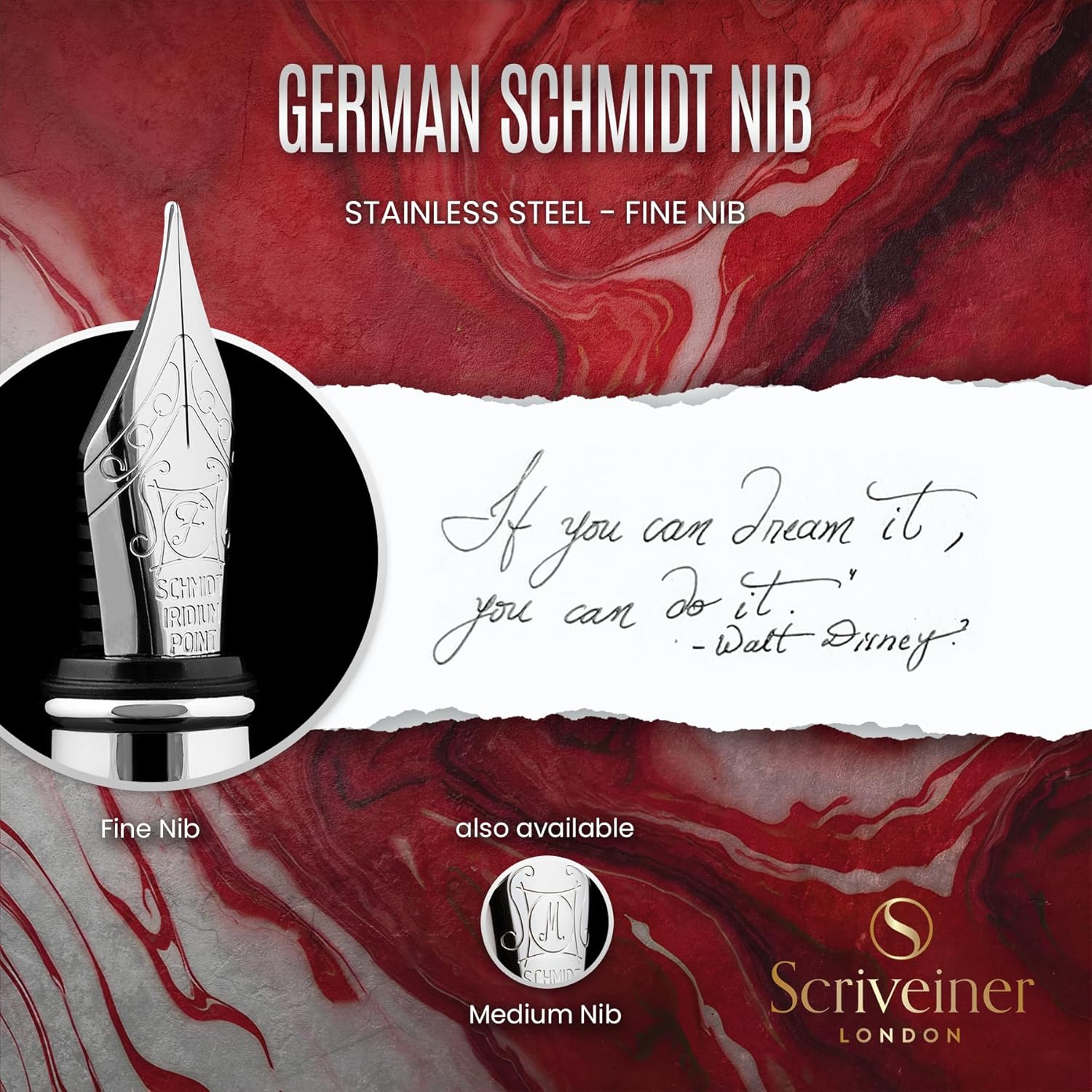Scriveiner Deep Crimson Red Fountain Pen - Stunning Luxury Pen with Chrome Finish, Schmidt Nib (Fine), Best Pen Gift Set for Men & Women, Professional, Executive, Office, Nice Pens