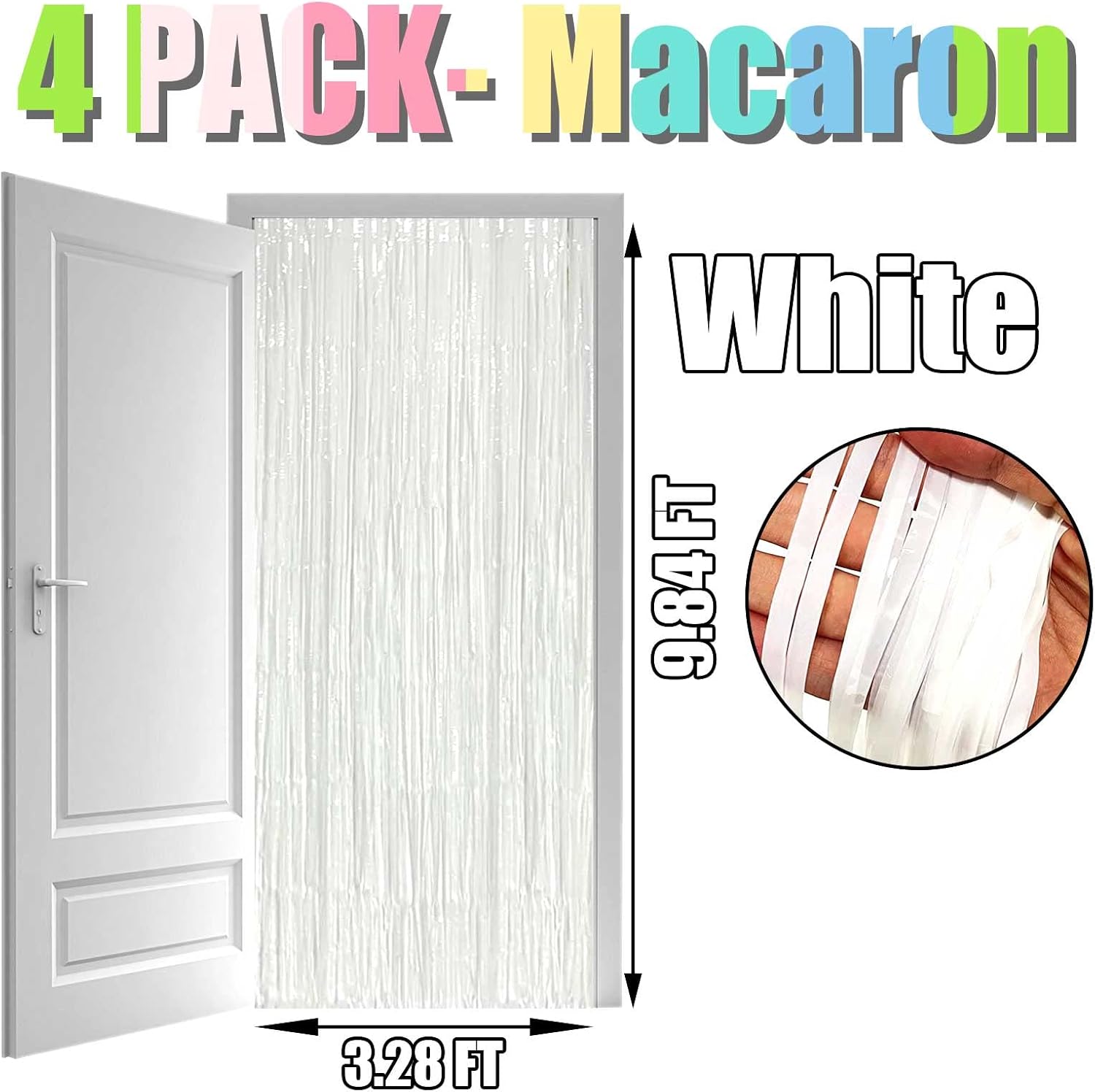 - The size of each foil fringe curtain is 3.2 feet wide and 9.84 feet long, Package include 4 pack foil fringe curtains, suitable for hanging on a door or coverage a wall fully.