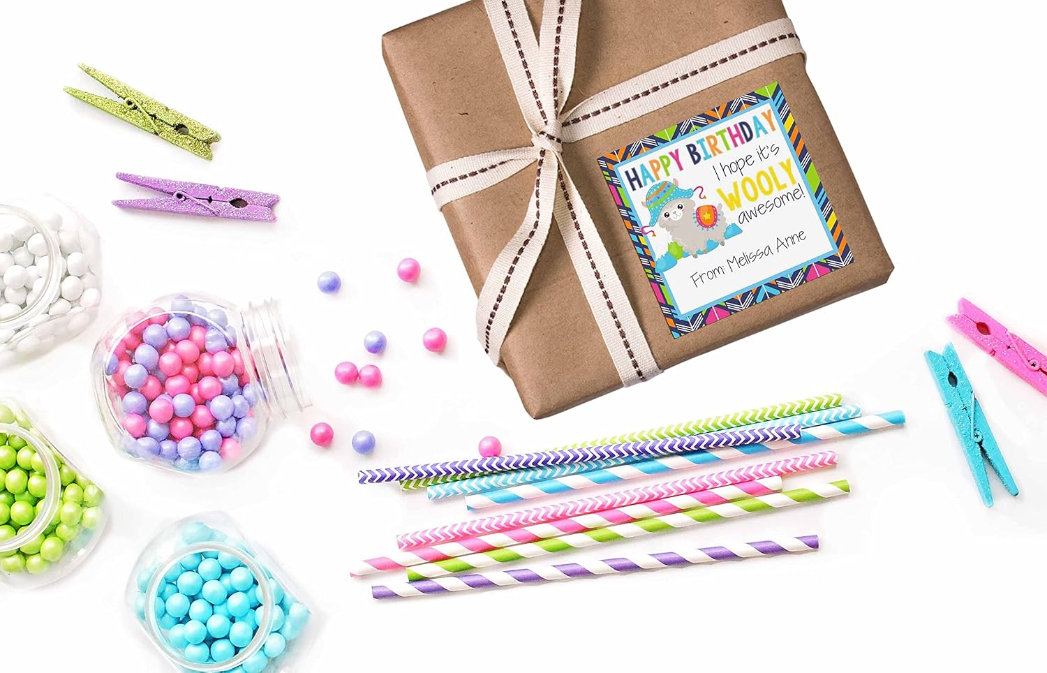 Custom & Personalized Wooly Awesome Alpaca Happy Birthday Gift Tag Sticker Labels, 24 2.5" Square Stickers by Amanda Creation