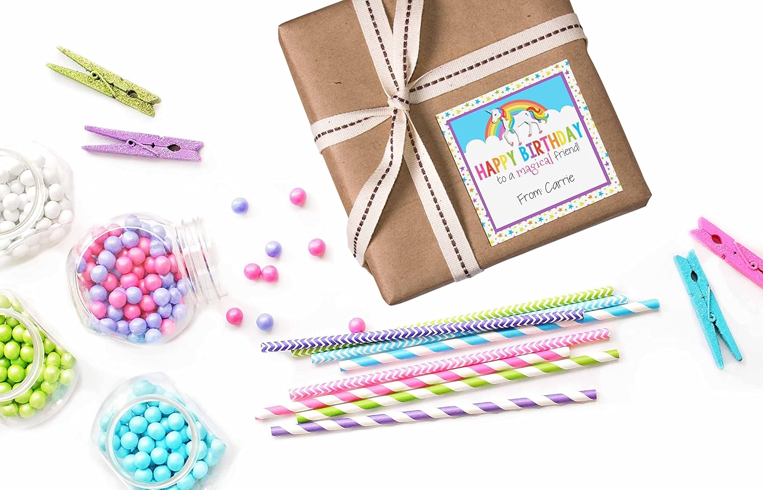 Custom & Personalized Rainbow Unicorn Happy Birthday Gift Tag Sticker Labels, 24 2.5" Square Stickers by Amanda Creation