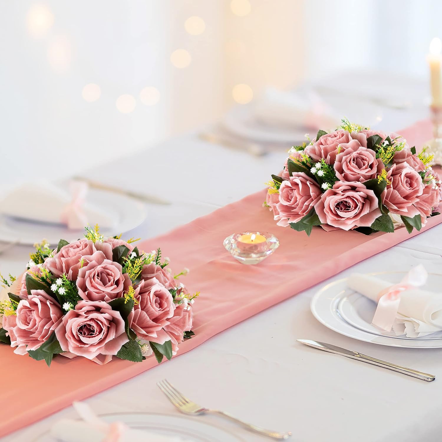 BLOSMON Dusty Pink Flowers Centerpieces: 2 Pcs Artificial Roses Flowers Balls for Wedding Dinning Table - Fake Silk Kissing Floral Arrangement for Home Party Event Decor