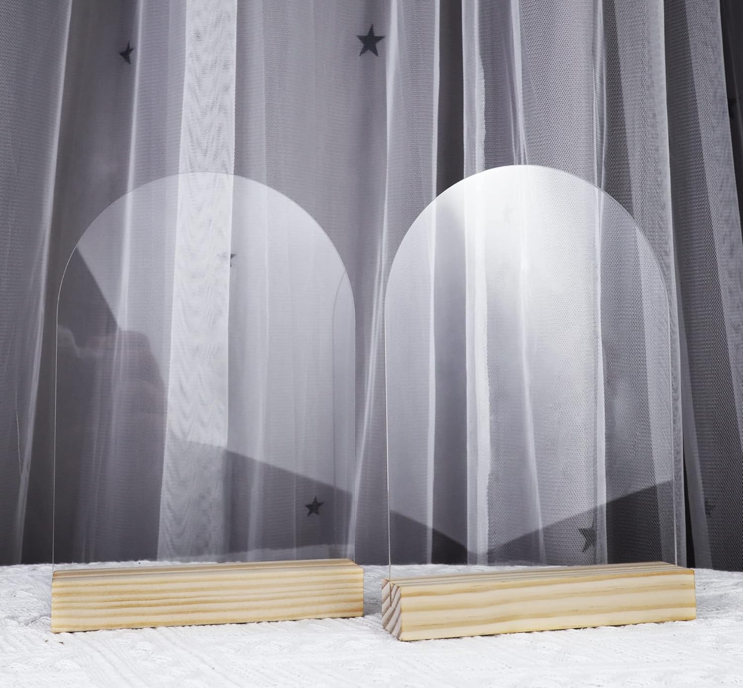- Delicate Design - Glass look acrylic is in trend! Our arch acrylic sign holder with stand, adds a stylish and modern look to your event. These acrylic signs have Sturdy and wide wood base, which ensure that your table number, card, or photo will always be upright during your event. They would be perfect acrylic gift table arch sign holders, picture stands for table, wedding gift cards.