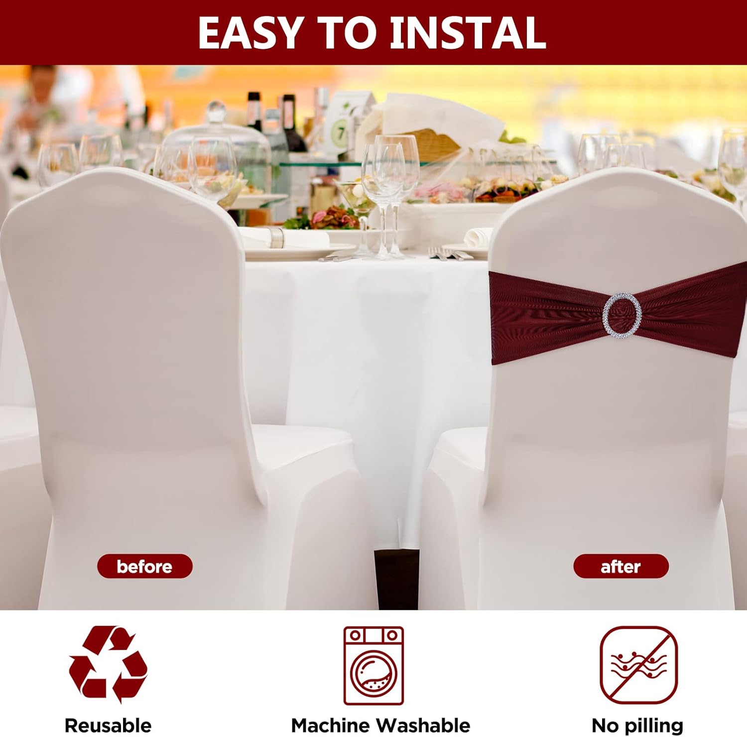 CHENGU 150 Pieces Spandex Stretch Chair Sashes Bows Elastic Chair Cover Bands Ties with Buckle Slider for Wedding Party Reception Events Universal Ceremony Banquet Decorations(Burgundy)