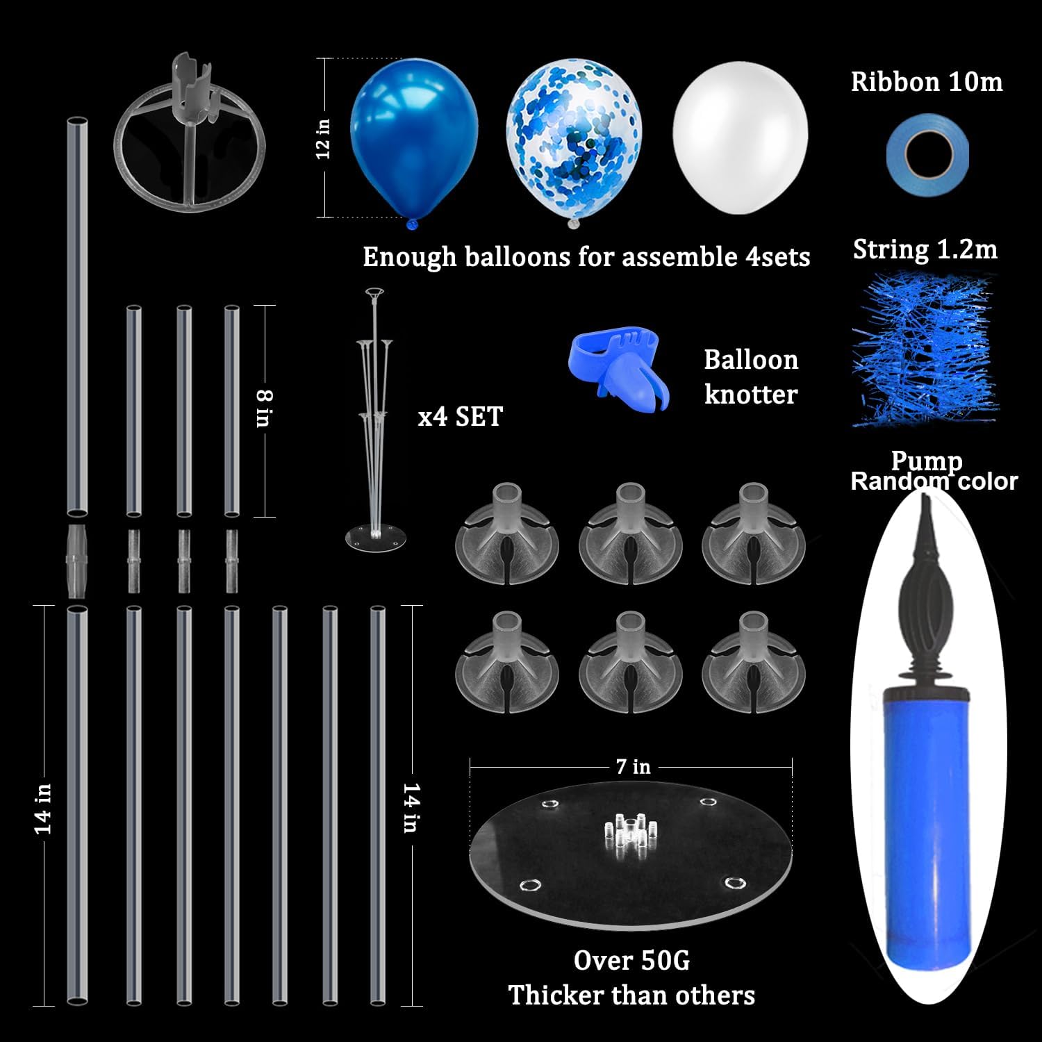 - WHAT INLCUDE: This balloon stand kit include 4 set balloon holders, 35 pcs balloons - blue and confetti balloons, white balloons, balloon pump, ribbons, glue dots and tie tool