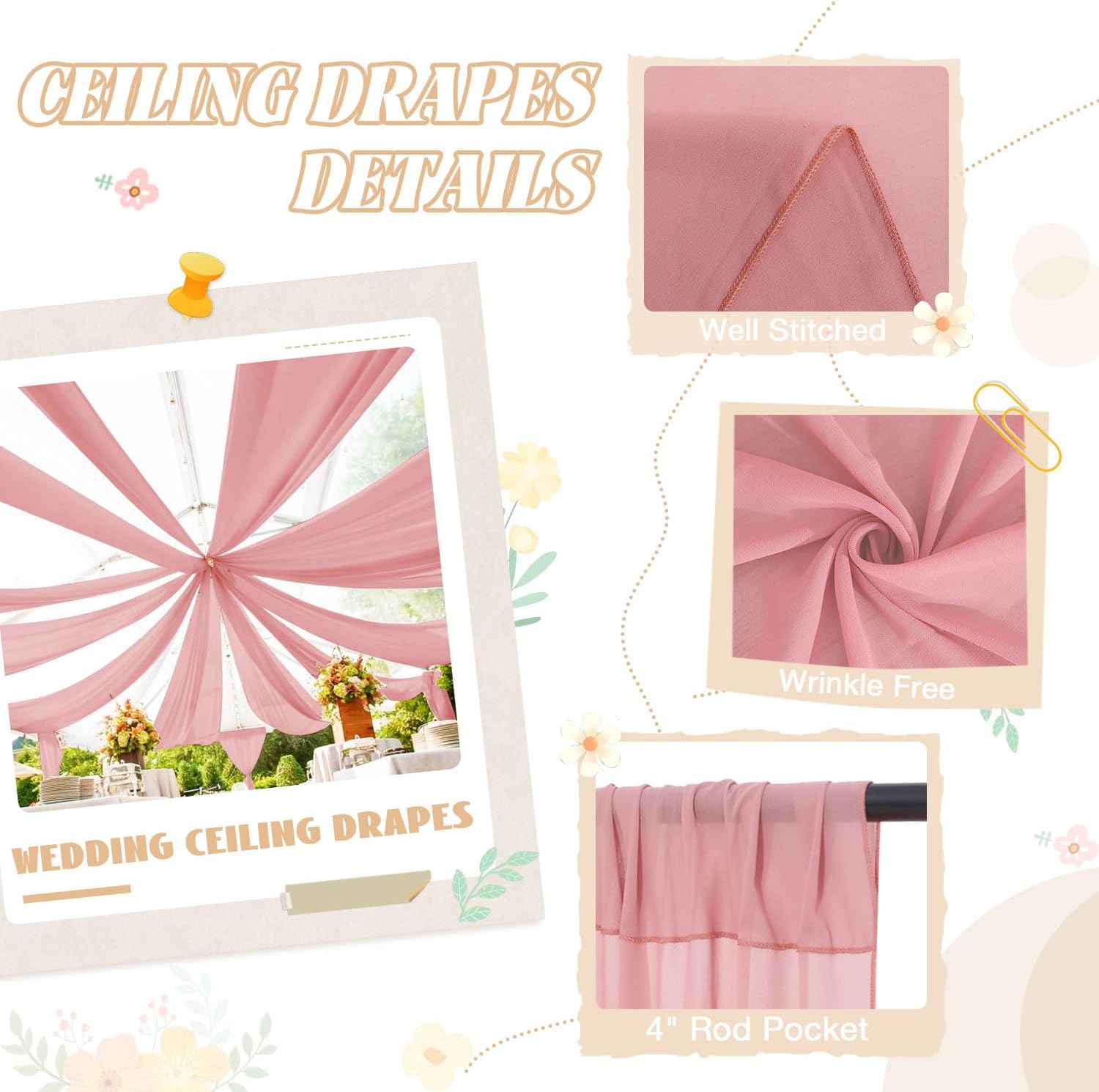 - ✿【Size - Wedding Ceiling Drapes】Package includes 2 panels dusty rose wedding arch drapes. Size of each panel is 5FT( 60 inches) width by 20FT( 240 inches) length covering a total area of 10ft width x 20FT length. This party ceiling drapes can help your party to create a warm and elegant scenes.