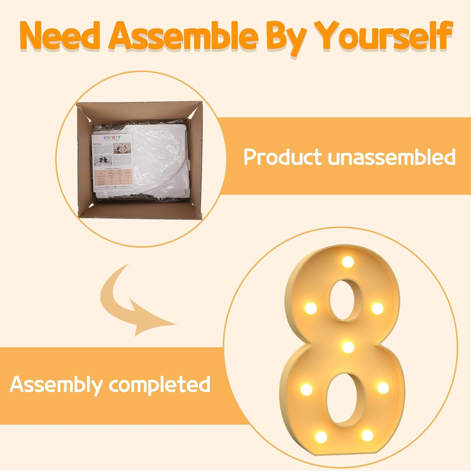 - Assembly Required: Our large marquee numbers is made from foam board and easy to assemble with our splicing mode. Just follow the numbered instructions to align and insert the bottom plate, and reinforce it with a hot glue gun. Then, you're done!