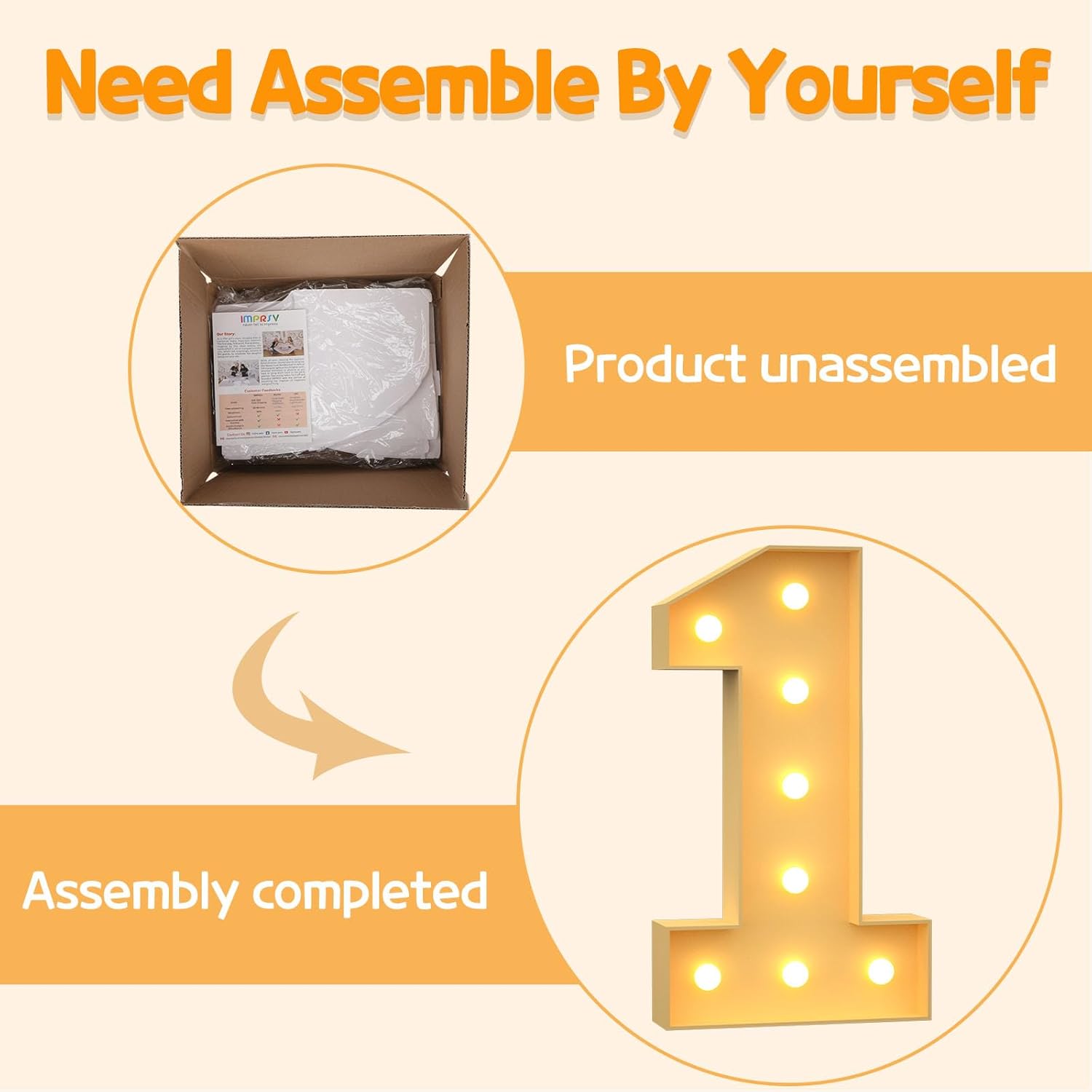 - Assembly Required: Our large marquee numbers is made from foam board and easy to assemble with our splicing mode. Just follow the numbered instructions to align and insert the bottom plate, and reinforce it with a hot glue gun. Then, you're done!