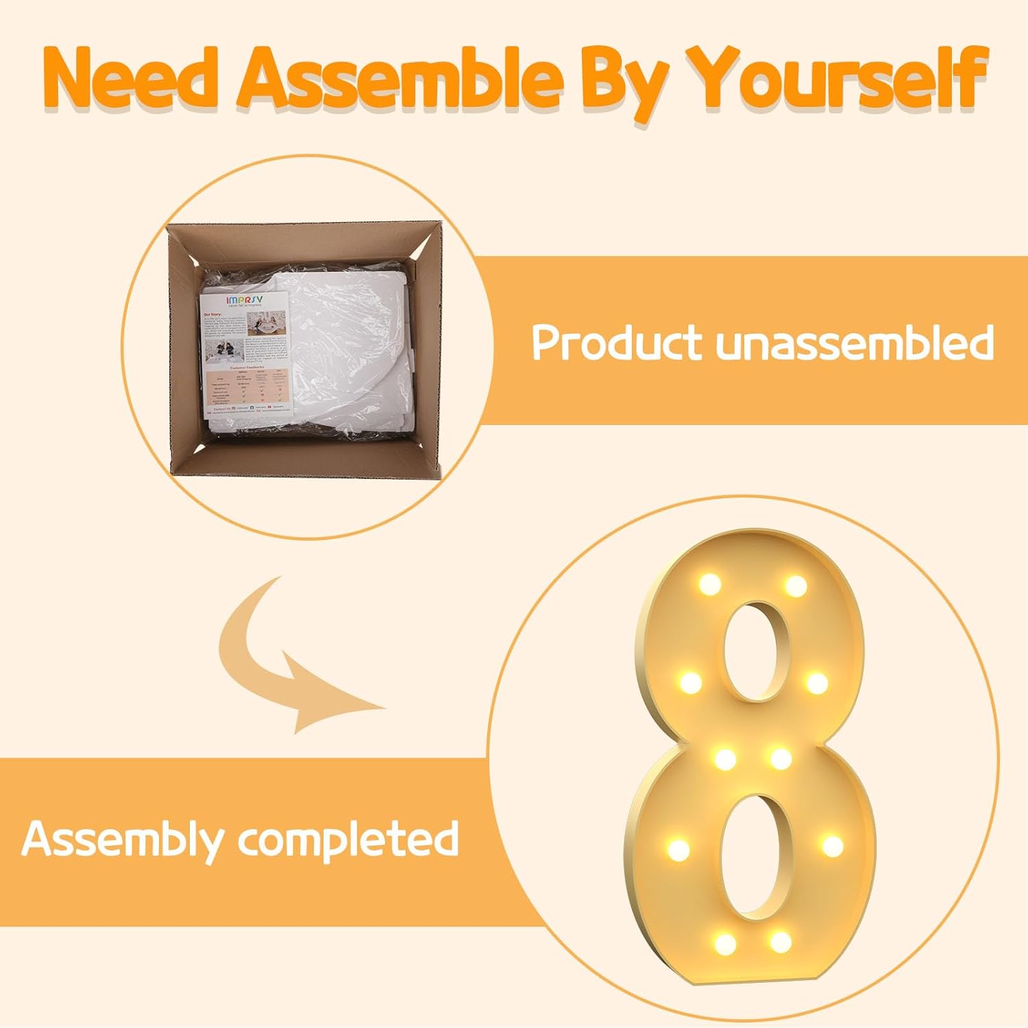 - Assembly Required: Our large marquee numbers is made from foam board and easy to assemble with our splicing mode. Just follow the numbered instructions to align and insert the bottom plate, and reinforce it with a hot glue gun. Then, you're done!