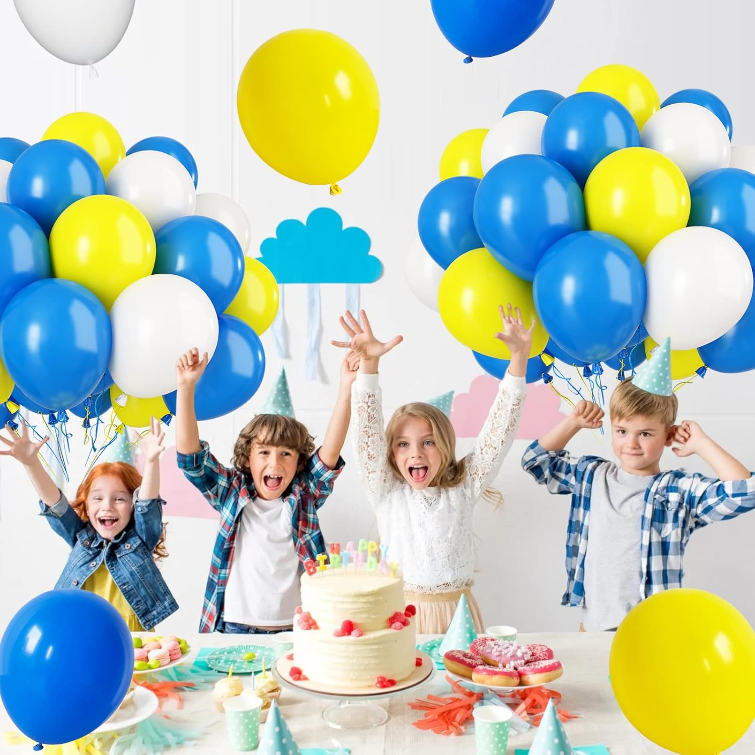 - Easy To Assemble: The yellow blue white balloons are easily filled with helium or air. The party balloons can be inflated with air pump. You can use the ribbon decorate to make the birthday party balloons look more beautiful. Creating an unique balloons decoration with your family or friends.