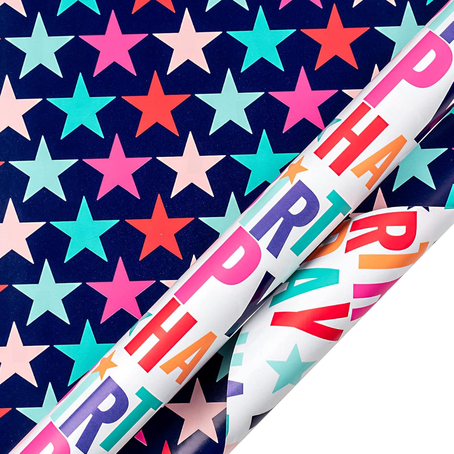 - Star-Printed Happy Birthday Wrapping Paper: This vibrant and playful wrapping paper features a lively design of bold "HAPPY BIRTHDAY" lettering in an array of colorful, eye-catching shades. The letters are complemented by fun stars scattered throughout, bringing a sense of celebration and excitement to the design. The reverse side features a navy background adorned with an array of colorful stars, offering a more subtle yet equally festive look.