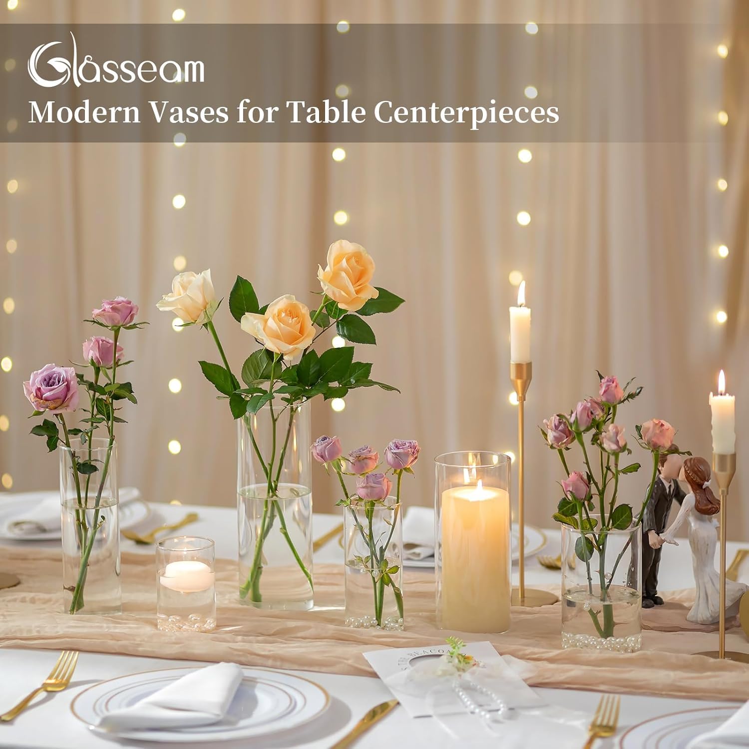 Glasseam Clear Cylinder Vases for Centerpieces, Glass Cylinder Vase Set of 6, Hurricane Vase for Flowers, Glass Cylinder Candle Holder for Pillar Candles, Floating Candle Vases for Wedding Decorations