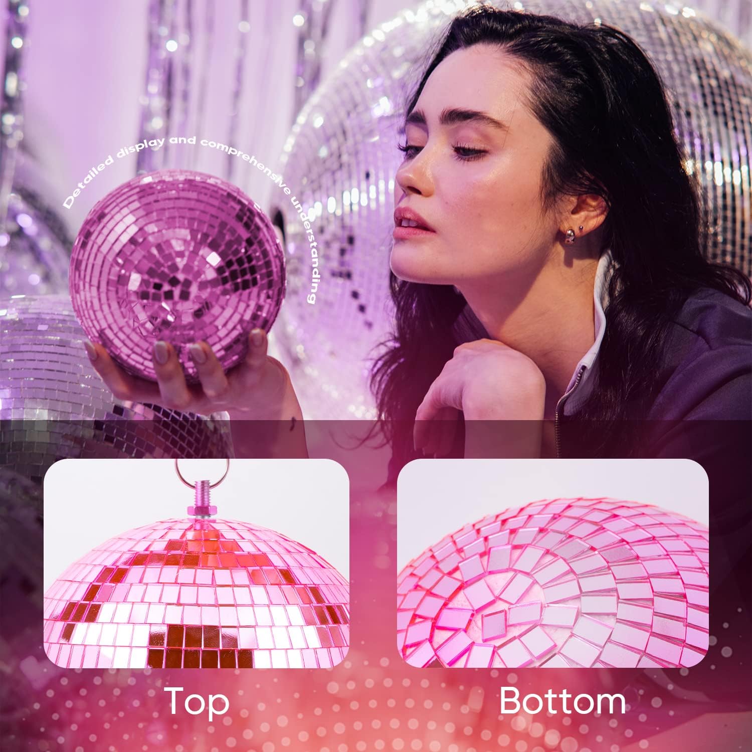 - Premium Pink Mirror Ball: This shimmery mirror ball is well-constructed with foam inner ball covered; When light is directed at mirror ball, each facet reflects light back into the air, casting it into dozens of small beams that stream out in all directions; The disco ball can create a unique, magical effect; The large disco ball have mirrored surfaces that refracts sunlight to fill the room with a warm glow , ideal for school dances, weddings and other big parties