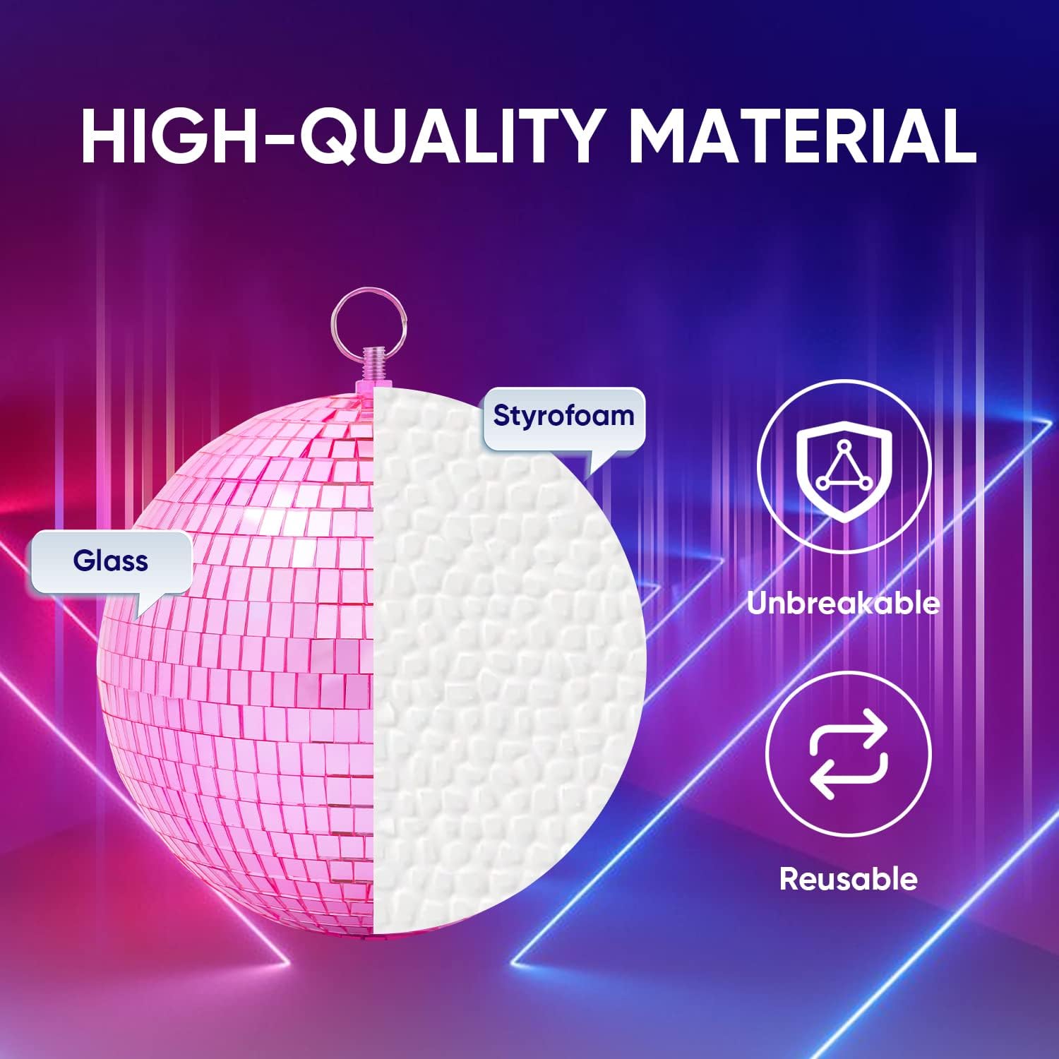 - Material and Structure: You'll love this 8 inch disco ball that provides lots of light; The small disco ball features bright pink tiles glued around a hollow styrofoam core; Spacing of each glass is consistent and the tiles are all the same color, making the light more even; This disco ball can be stored and reused thanks to its solid construction.It makes great disco party decorations