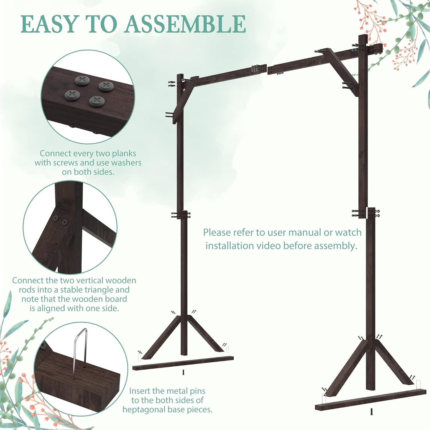 - 【Easy to Assemble】Connect every two planks with tools and insert metal pins to the base pieces. The wedding arbor can be easily setup and disassemble by following user manual or watch installation video before assembly. Note: After assembly, two people are needed to support the wooden arch to stand to avoid damage.