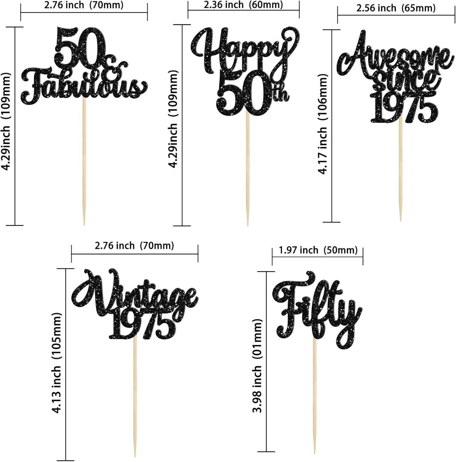 30Pcs Happy 50th Birthday Cupcake Toppers Glitter Fifty Vintage 1975 Cupcake Picks Cheers to 50 Fabulous Cake Decorations for 50th Birthday Wedding Anniversary Party Supplies Black