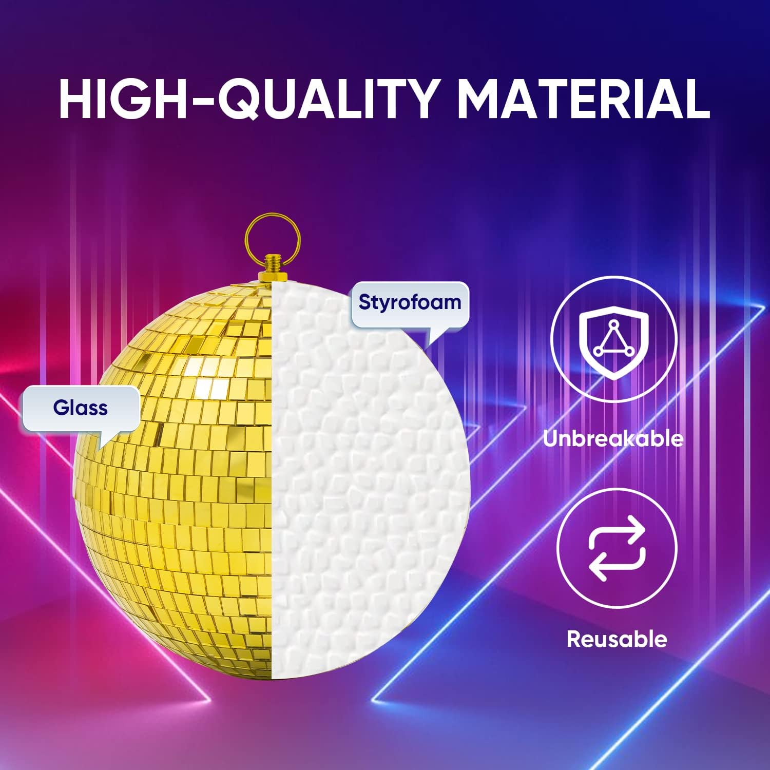 - Material & Structure: You'll love this 8 inch gold disco balls, our disco ball features a premium mirror surface that reflects light with exceptional beauty, spacing of each glass is consistent and the tiles are all the same color, making the light more even. This hanging disco ball can be stored and reused thanks to its solid construction.It makes great disco party decorations.