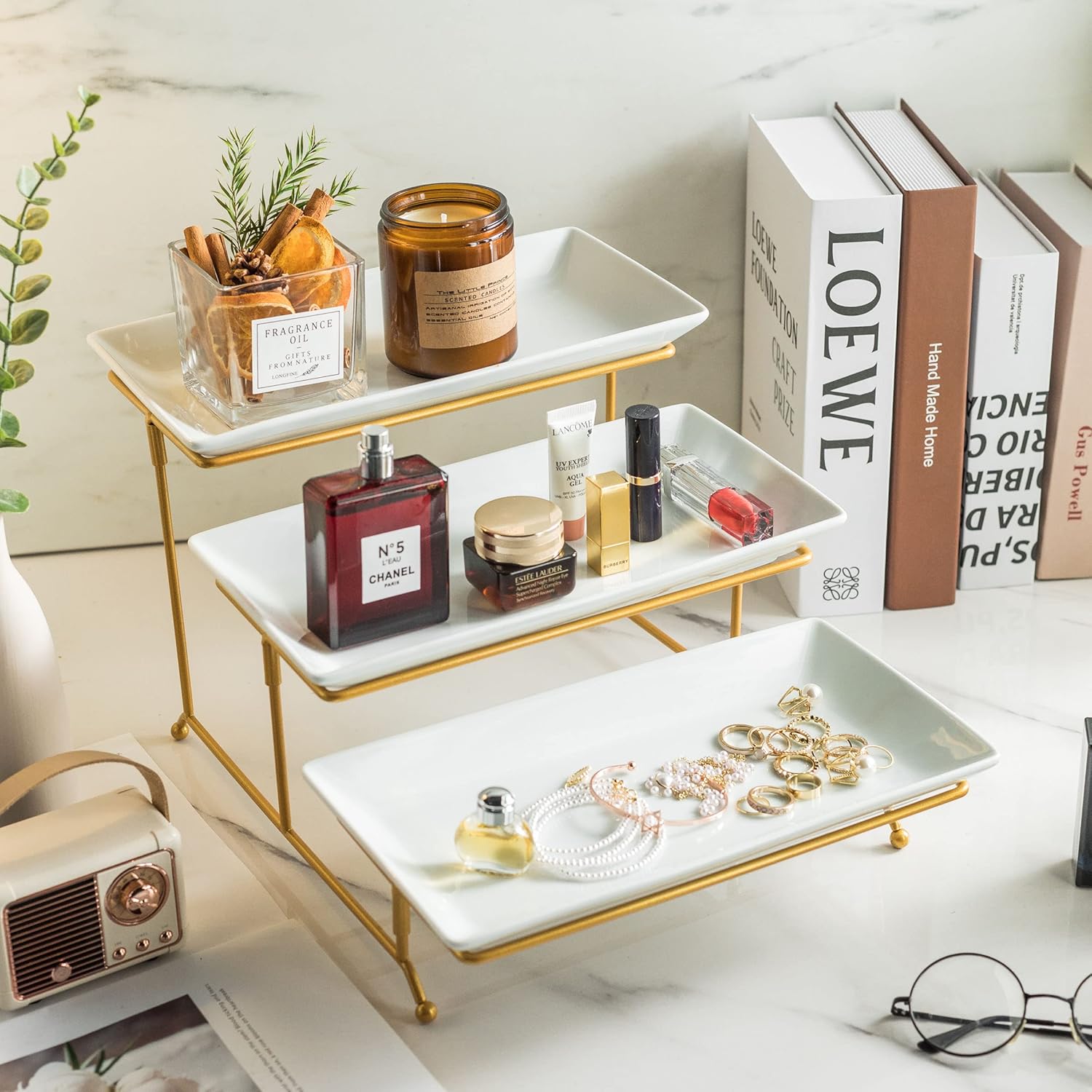 - Kitchen Must-have: 3 tier serving stand consists of three 11.69"×6.18" ceramic serving platters and a gold metal stand. The serving tray can be used as a three-tier table display stand, or the platters can be used alone as serving dishes. This tiered serving stand is sure to become a staple in your kitchen