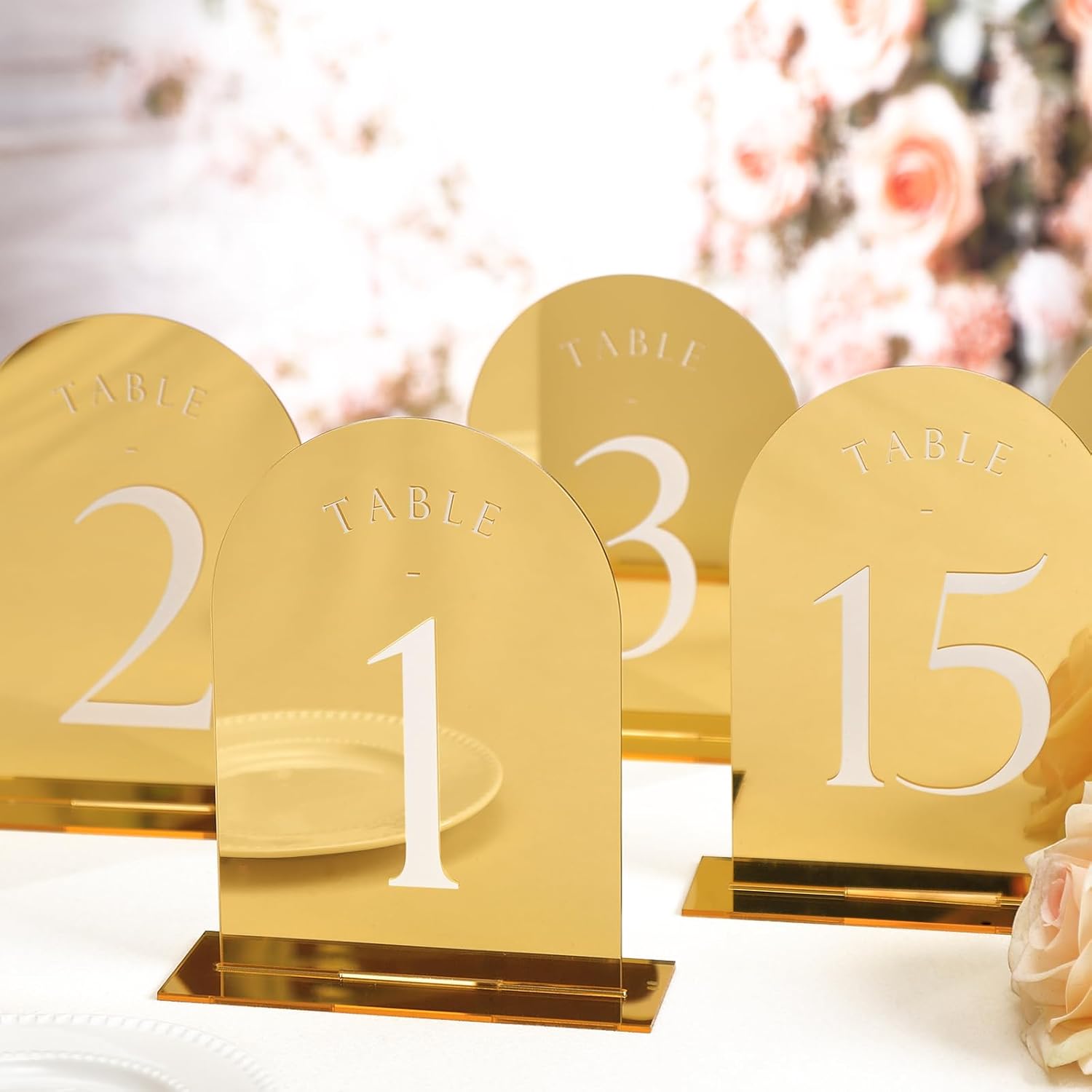 UNIQOOO Gold Mirror Arch Wedding Table Numbers with Stands 1-15, 5x7 Acrylic Display Signs and Holders, Pack of 15, Perfect for Centerpiece, Reception, Decoration, Party, Anniversary, Event