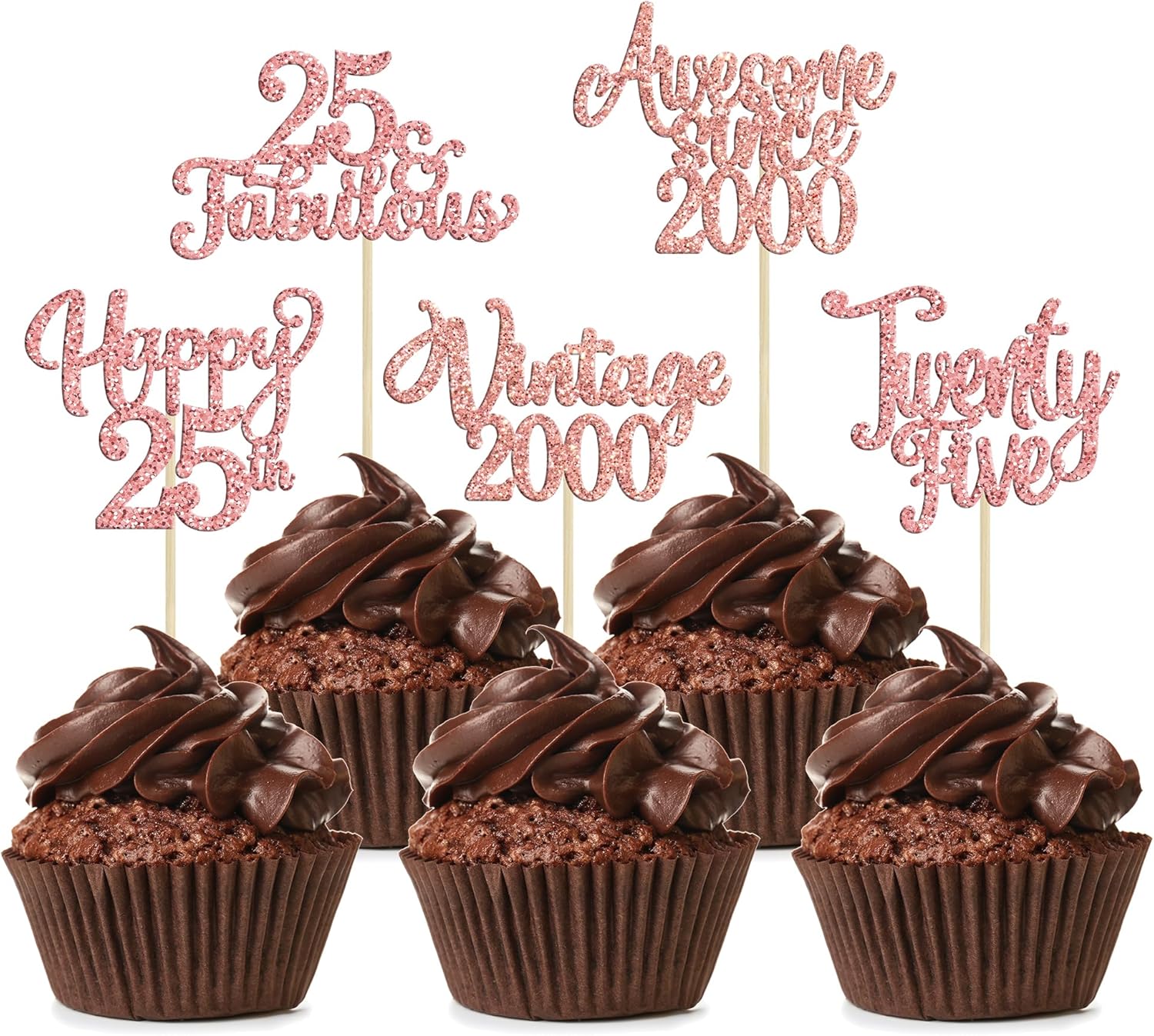 30Pcs Vintage 2000 Cupcake Toppers Glitter Twenty-Five 25 Fabulous Happy 25th Birthday Cupcake Picks Awesome Since 2000 Cake Decorations for 25th Birthday Retirement Party Supplies Rose Gold