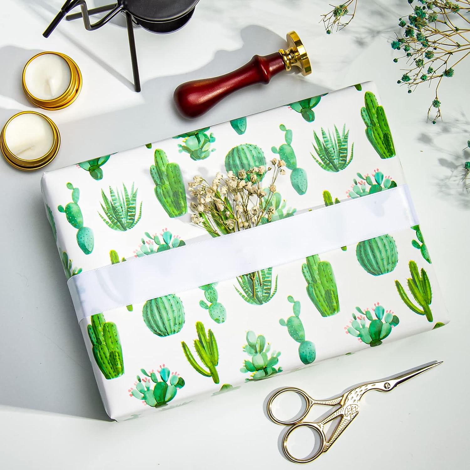 WRAPAHOLIC Reversible Cactus Wrapping Paper - Mini Roll - 17 Inch X 33 Feet - Watercolor Green Cactus Hawaii Wrapping Paper for Birthday, Wedding, Bridal Shower, Baby Shower