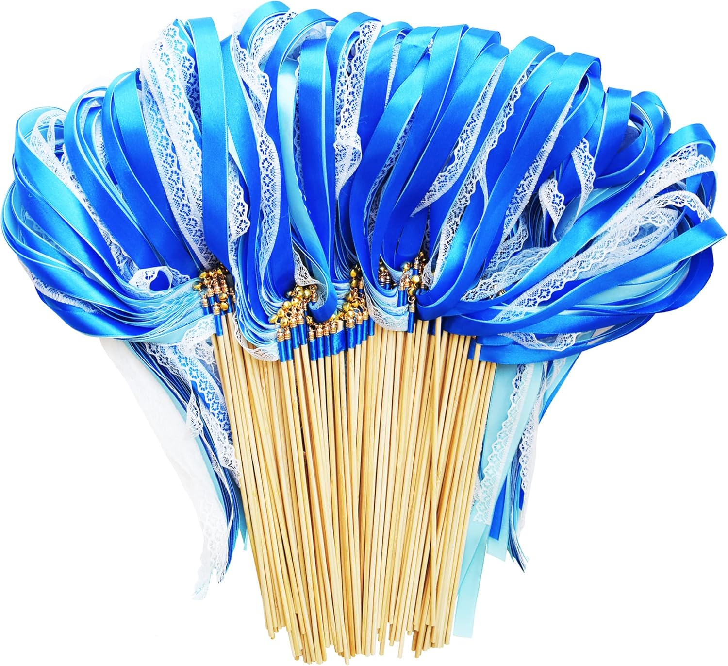 - 100 pieces wedding ribbon wands are well crafted with smooth wooden stick handles, all blue ribbons and bells are securely attached to prevent them from slipping off when waved around, bringing you nice using experience. Accepted in almost any venue as an alternative to confetti or rice, your guests will have a great time participating in the merry making.