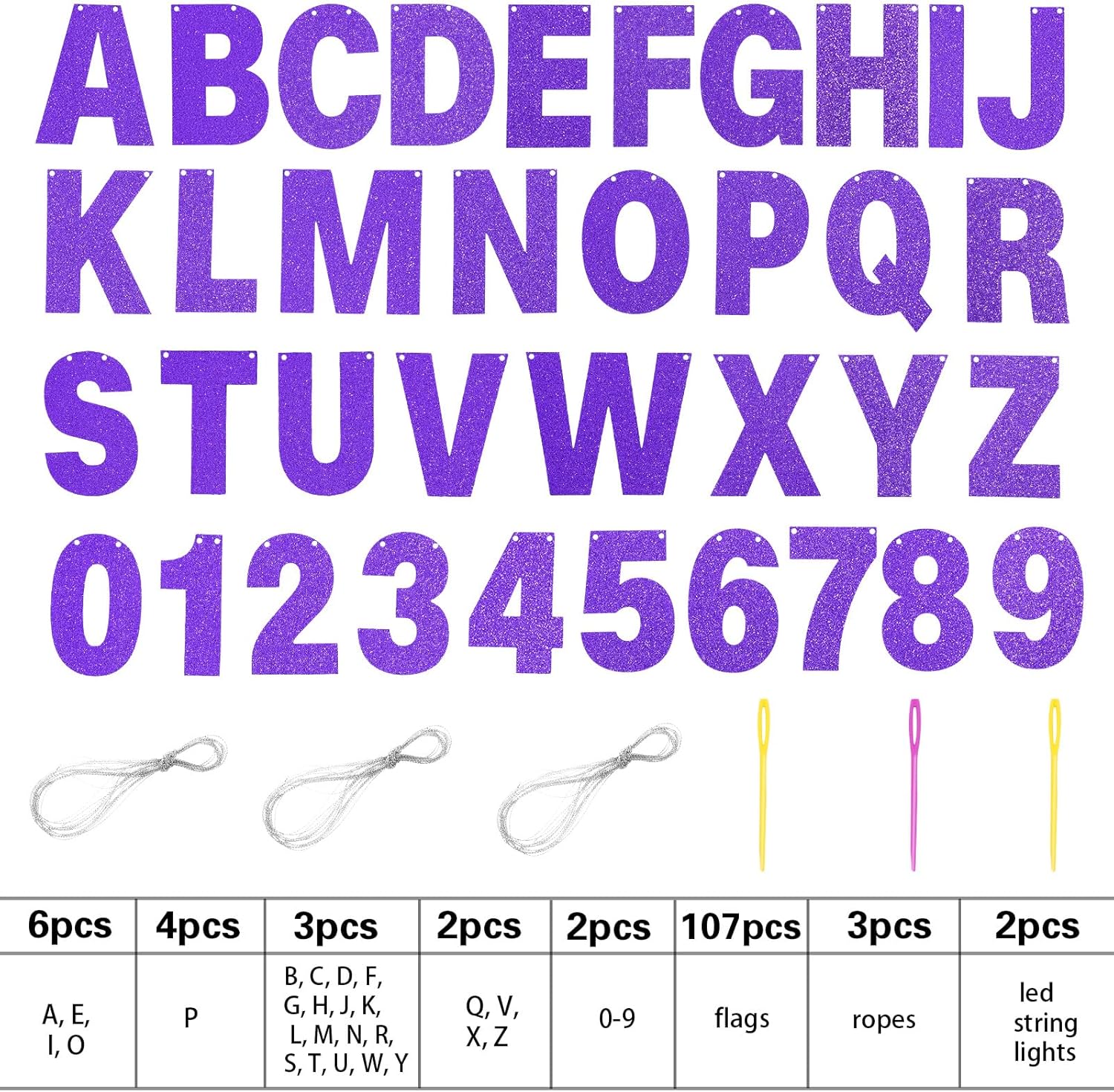 - DIY Banner Kit with Letters: you will get 107 pieces of letters and numbers, including 6 'A, E, I, O' letters, 4 'P' letters, 3 'B, C, D, G, H, J, K, L, letter M, N, R, S, T, U, letter W, Y, F shape' letters, 2 'Q, V, X, Z' letters and 2 '0-9' numbers, come with 3 ropes; Nice combination meet your various parties decorative demands