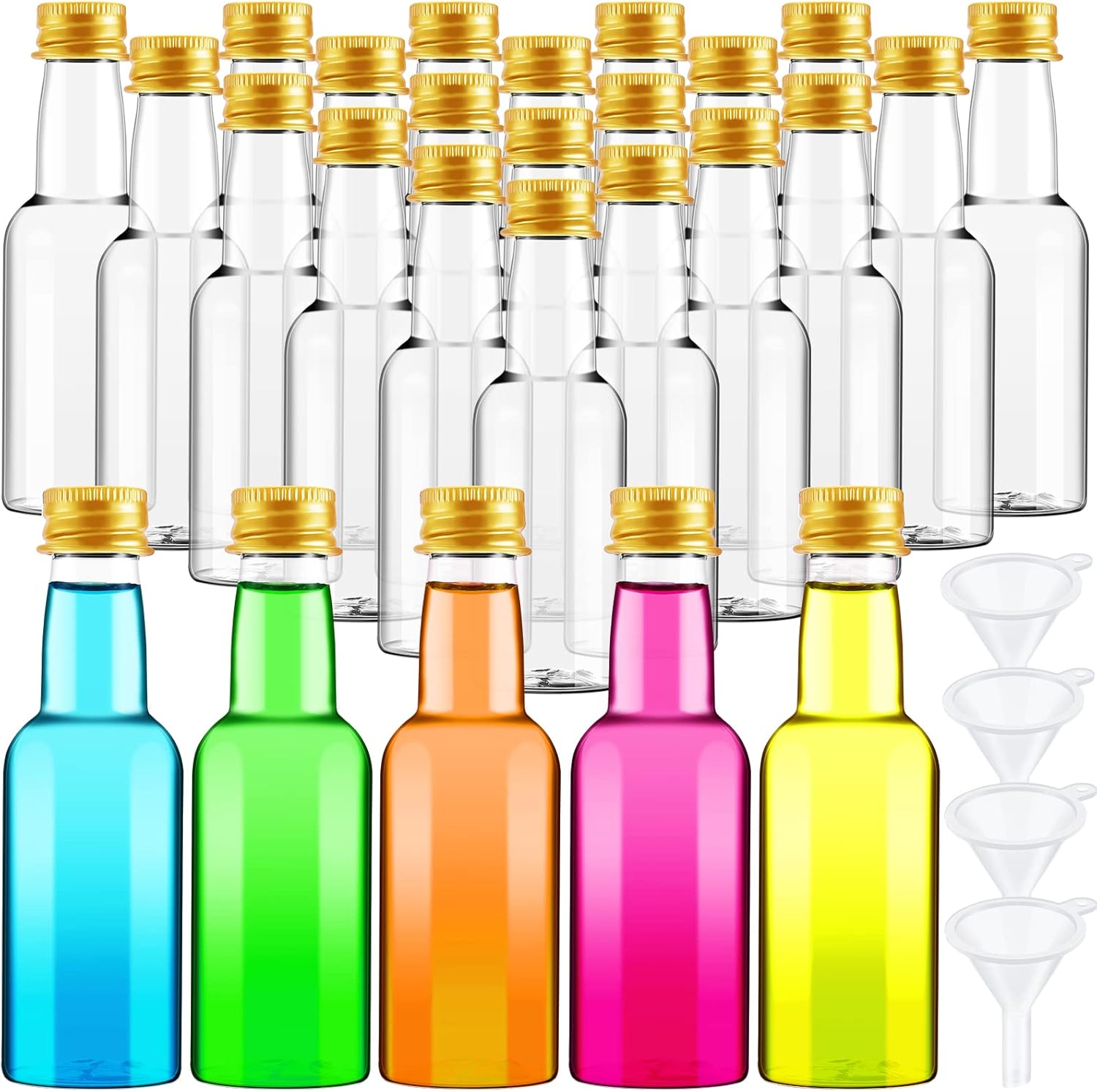 Zubebe 200 Pcs Mini Liquor Bottles 1.7 oz Plastic Empty Spirit Bottle with Screw Cap Liquid Funnel Easy Pouring(Gold)